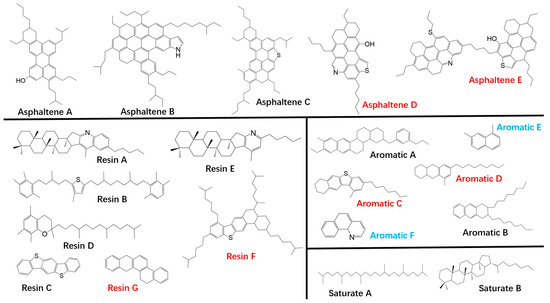 One approach has been to capture asphalt chemistry by defining broad categories of molecules. This method relies on generic SARA fractions or other asphalt separations [21]. These groups with their different polarities have been related to the colloidal nature of asphalt. For example, resins act as dispersing (peptizing) agents for large asphaltene aggregates within the more nonpolar maltenes fractions. While there has been some success in relating properties to the SARA composition, the number of components and their imprecise definition limits its utility for conceptual advances on the basis of fundamental chemical principles. In seminal papers, Zhang and Greenfield [15] and Li and Greenfield [18] made a significant step forward when they proposed sets of model compounds—eventually 12 actual molecular structures—representing the SARA fractions. These molecules with structures appropriate to the various fractions have been used by a number of researchers for molecular dynamics studies of asphalt. Wang [20] modified the composition of the Li and Greenfield model, principally with the addition of aromatic and resin molecules to accommodate high sulfur asphalts. The combined molecular structures from these groups (Figure 1) enabled the study of physical properties of virgin asphalt binders with molecular dynamics [22].