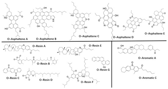 Proposed oxidized forms of the virgin asphalt compounds designated with prefix O. Oxidation creates ketones, sulfoxides, alcohols, enols with aromatization (ketone tautomers), anhydrides, and carboxylic acids [22].