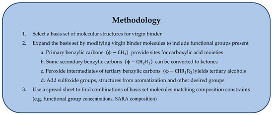 The objective of this study is to advance the structures and compositions used in simulations of aged asphalt binder. Prior work on aged, oxidized asphalt binder has not accurately represented the range of known functional groups and their concentrations [8]. This is important because, in addition to the usual expectation of structure–property relationships, dependence of physical properties on functional group composition for asphalt follows from viscosity relationships reported by Peterson [9,10,11], a leading researcher for many years on the chemistry of asphalt. Moreover, using molecular structures closer to their actual atomic structure is conceptually appealing and in line with recent trends. Lastly, in this study, we demonstrate how a researcher using MD can mix and match elements from the basis set to align functional group and SARA compositions with real aged asphalt binder samples.