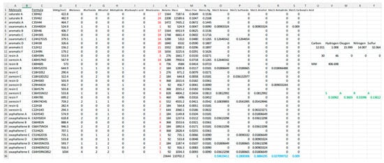 The composition shown in Table 1 is not unique. Other combinations of this aged asphalt basis set or others could meet composition constraints. A spreadsheet tool (Figure 5) was developed to aid selection of compounds and find a composition matching the reported functional group concentrations. Table 1 presents a sample composition with the number of each basis set compound shown. On entering the number of each molecule in the spreadsheet (shown in red), one obtains a SARA composition of 17% saturates, 36% aromatics, 33% resins, and 14% asphaltenes (green). In addition, sample A1 yields concentrations of 0.5962, 0.2800, 0.3884, 0.0271, and 0.0090 mol/L for ketone, sulfoxide, alcohol, anhydride, and carboxylic acid, respectively (blue). Figure 5 shows the spreadsheet tool with data on a line for each of the 34 basis structures (molecular formula, molecular weight, #ketones, #sulfoxides, #alcohols, #anhydrides, and #carboxylic acids). Chang et al. employed this aged binder composition to investigate waste cooking oil as a rejuvenator using molecular dynamics [22]. Other virtual samples for MD simulations of aged (or virgin) asphalt can be prepared by selecting other combinations of the FGM set.