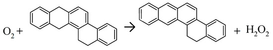 Recently, M. Xu et al. developed a new oxidized asphalt model with significant advances based on chemistry [39]. As opposed to having only oxidized molecules, some of the original virgin asphalt structures were also included in aged asphalt samples. The combination of unoxidized and oxidized species creates molecular interactions similar to the presence of partially oxidized structures while keeping the total number of species manageable. Xu used an expanded basis set to include structures proposed by Wang et al. [20]. Of particular note is a more sophisticated effort to consider oxidation chemistry in forming structures found in aged asphalt. Petersen’s theory of fast and slow oxidation reactions [40] was employed to create reaction products. The fast reactions involve aromatization of polycyclic structures like resin G (Scheme 1) with byproduct hydrogen peroxide or other peroxide intermediates acting to oxidize thioethers to sulfoxides. Xu is the first to our knowledge to consider an aromatization component. Formation of polycyclic aromatics contributes to increased viscosity by greater association with the asphaltene fraction via π-bonding [11,41]. Peterson’s reaction scheme for oxidation of asphalt involved a slow reaction phase proceeding through formation of the hydroperoxide of a tertiary benzylic species which can decompose to an aryl ketone and an alcohol or a benzylic alcohol and other oxidation products such as a sulfoxide (Scheme 2). Considering all possible products of each tertiary benzylic carbon in the basis set, Xu et al. created an additional 21 possible product molecules [39]. Thus, their model for oxidized asphalt now included alcohols as well as ketones. Overall, up to 45 different species existed for the aged sample. Three types of asphalt used widely in north China were matched in SARA and H, N, O, and S compositions. Simulations were carried out to model AFM adhesion force and nano-hardness experiments.