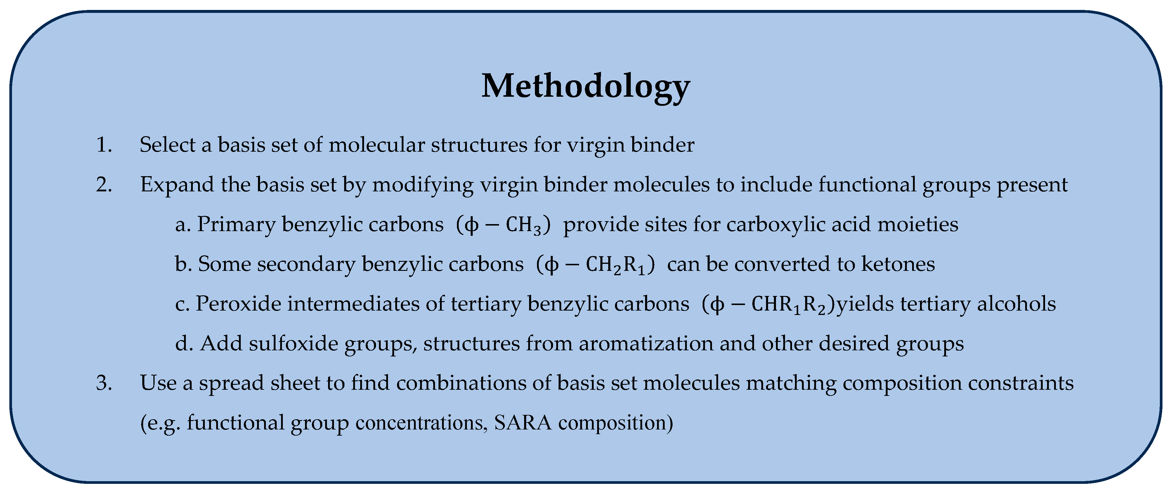 - Oxidation of secondary benzylic carbons yields ketones. Petersen’s dual (fast and slow) oxidation mechanism provides for the formation of ketones only from degradation of tertiary benzylic carbons. If this were true, one would expect to see the tertiary benzylic alcohols being formed contemporaneously with the ketone through their mutual hydroperoxide intermediate. Kinetic data [11] clearly shows that this is not the case. Ketone formation continues much longer after alcohol attains a constant value. This means ketones are being formed by other reactions. M. Xu only forms ketones through the tertiary benzylic hydroperoxide. Strong evidence indicates oxidation yielding ketones at the benzylic position [32] which in combination with the kinetic data for alcohols points to secondary benzylic carbons. Thus, we create ketone moieties in basis set structures from the secondary benzylic carbon molecules of the virgin asphalt models. Many, but not all such sites were oxidized.