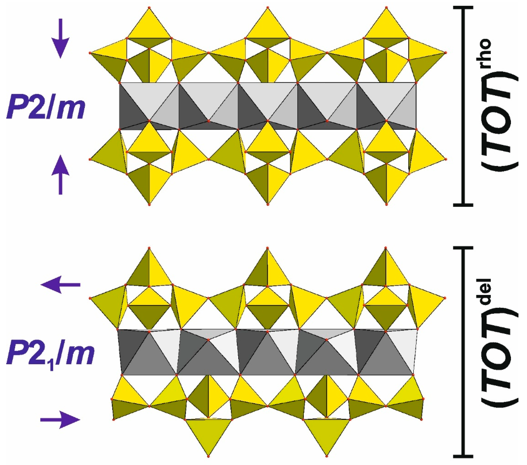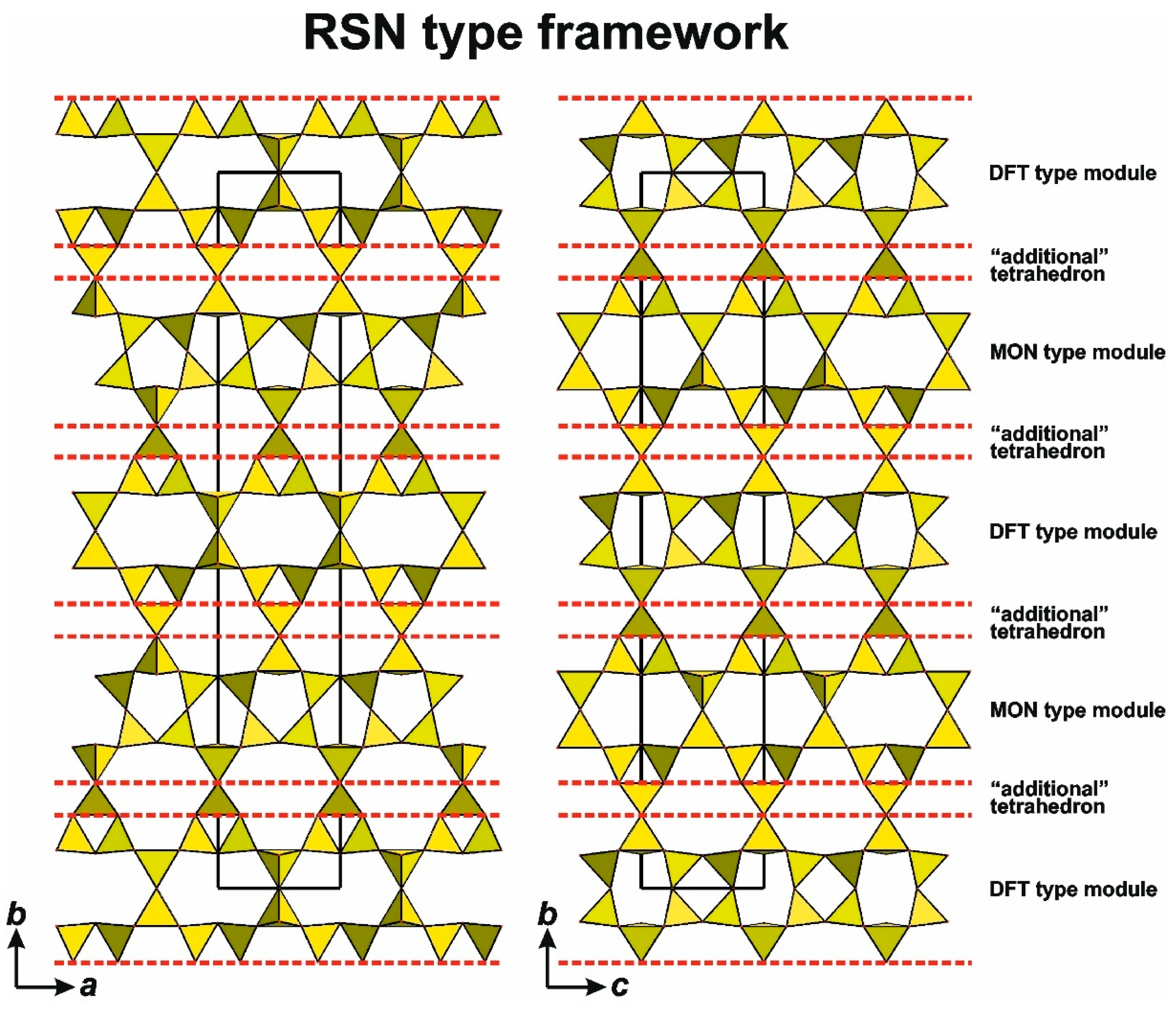 - Connection via an “additional” tetrahedron, analogous to the “günterblassite” mechanism of combining double-layer rhodesite-type layers.