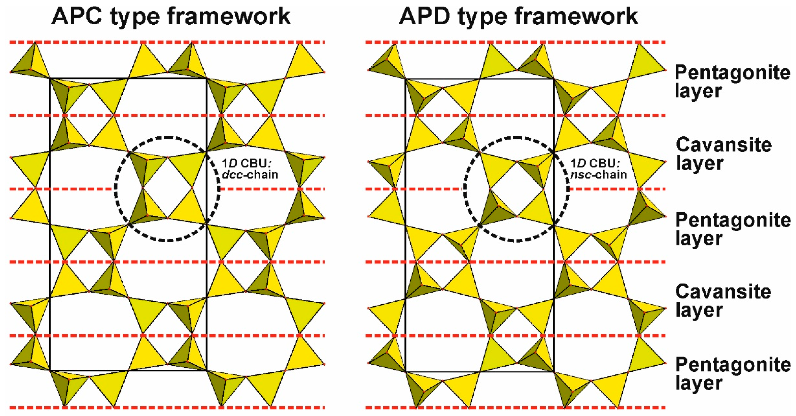 4.6.5. Frameworks Constructed by Combining Cavansite-Type Layers and Hybrid Frameworks with Alternating Cavansite- and Pentagonite-Type Layers