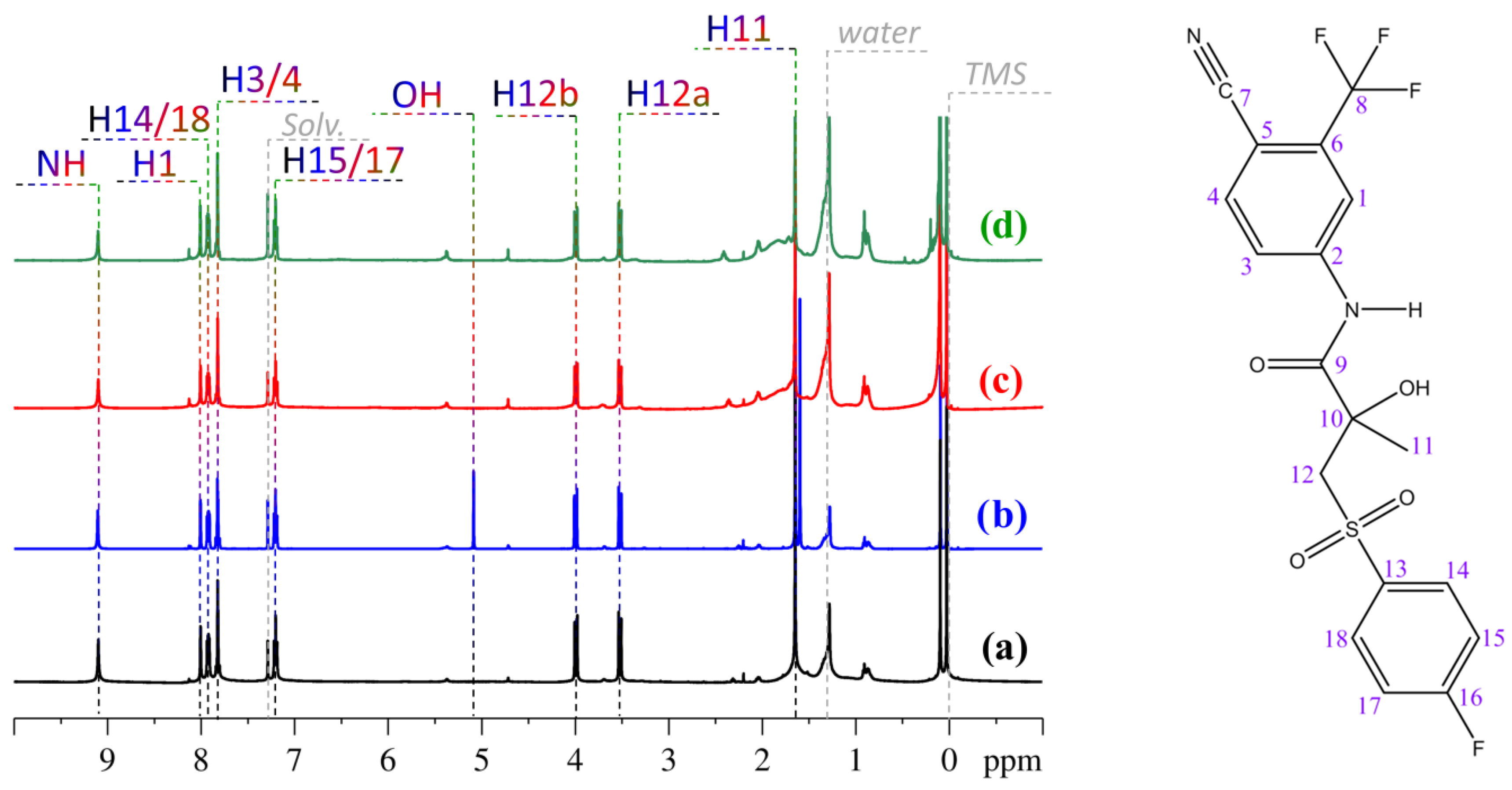 Figure 2. On the (left)—1H NMR spectra of BCL in saturated solution (a), solution without solid phase (b), «high» concentration solution (c), and «low» concentration solution (d). On the (right)—structure of bicalutamide with atom labels corresponding to the signal assignments in the spectra shown.