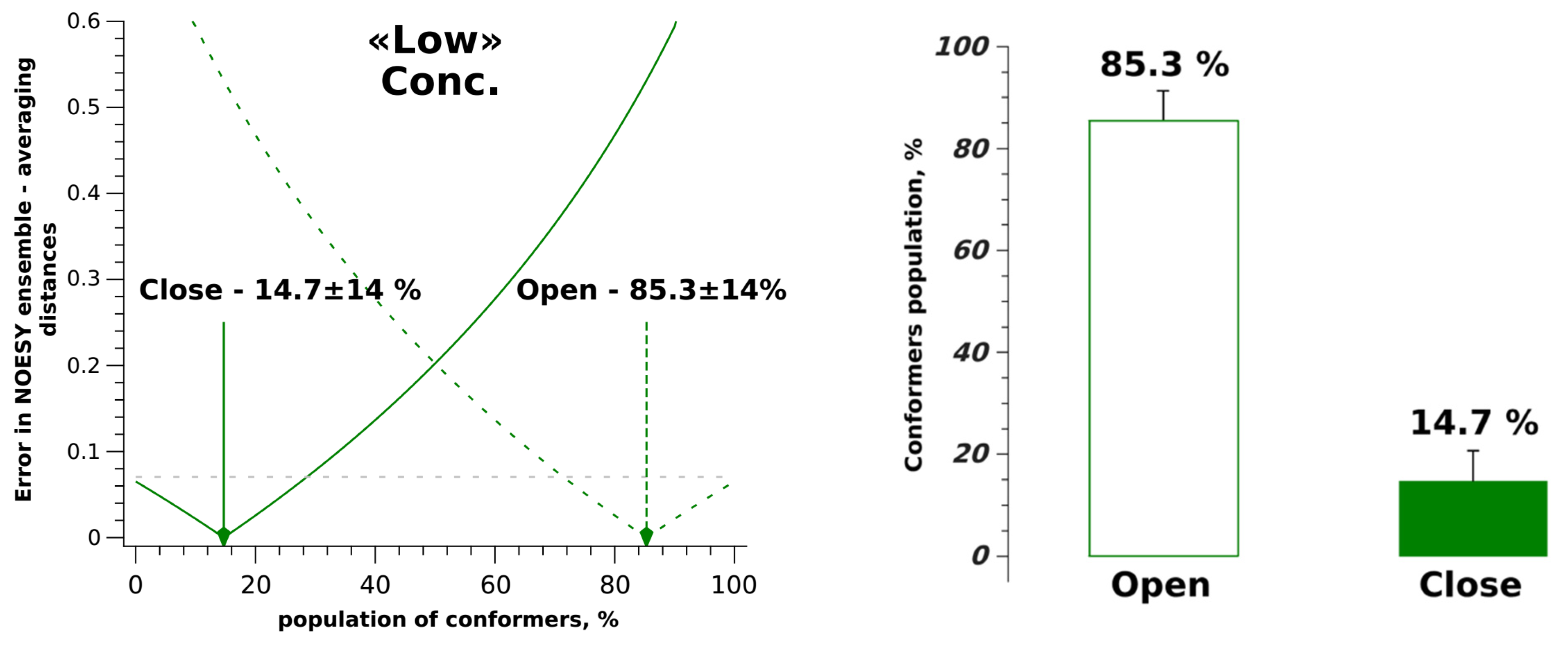 Figure 4. (Left column)—graphs of the difference between calculated and experimental values of the H12b-H14/18 distance as a function of the conformer population. The gray dashed line indicates the error limit in determining the conformer-defined distance from NOESY data. (Right column)—bar charts showing the distribution of «open» and «closed» conformers obtained from NOESY data and the H12b-H14/18 distance as conformer-defined.