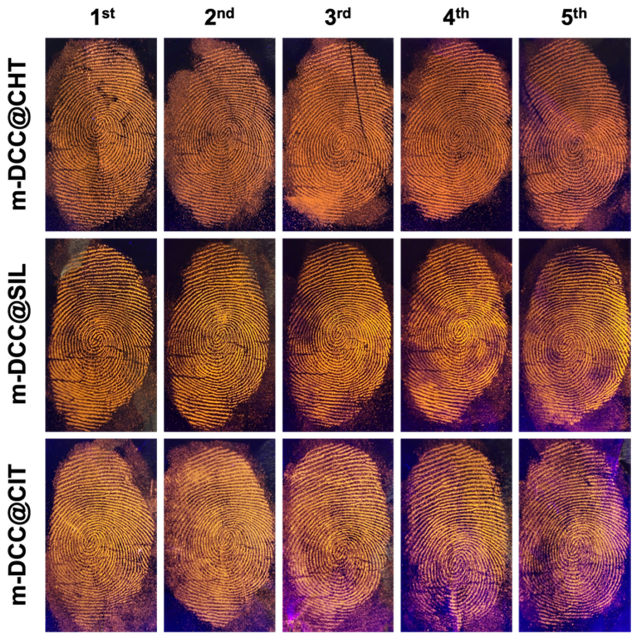 - Li, Y.; Hu, X.; Yao, H.; Ye, Y.; Zhou, J. Development of latent fingerprints by degradable highly-adhering powder—A long-term strategy for the fading of fingerprint residues. Dye. Pigment. 2023, 219, 111597. [Google Scholar] [CrossRef]