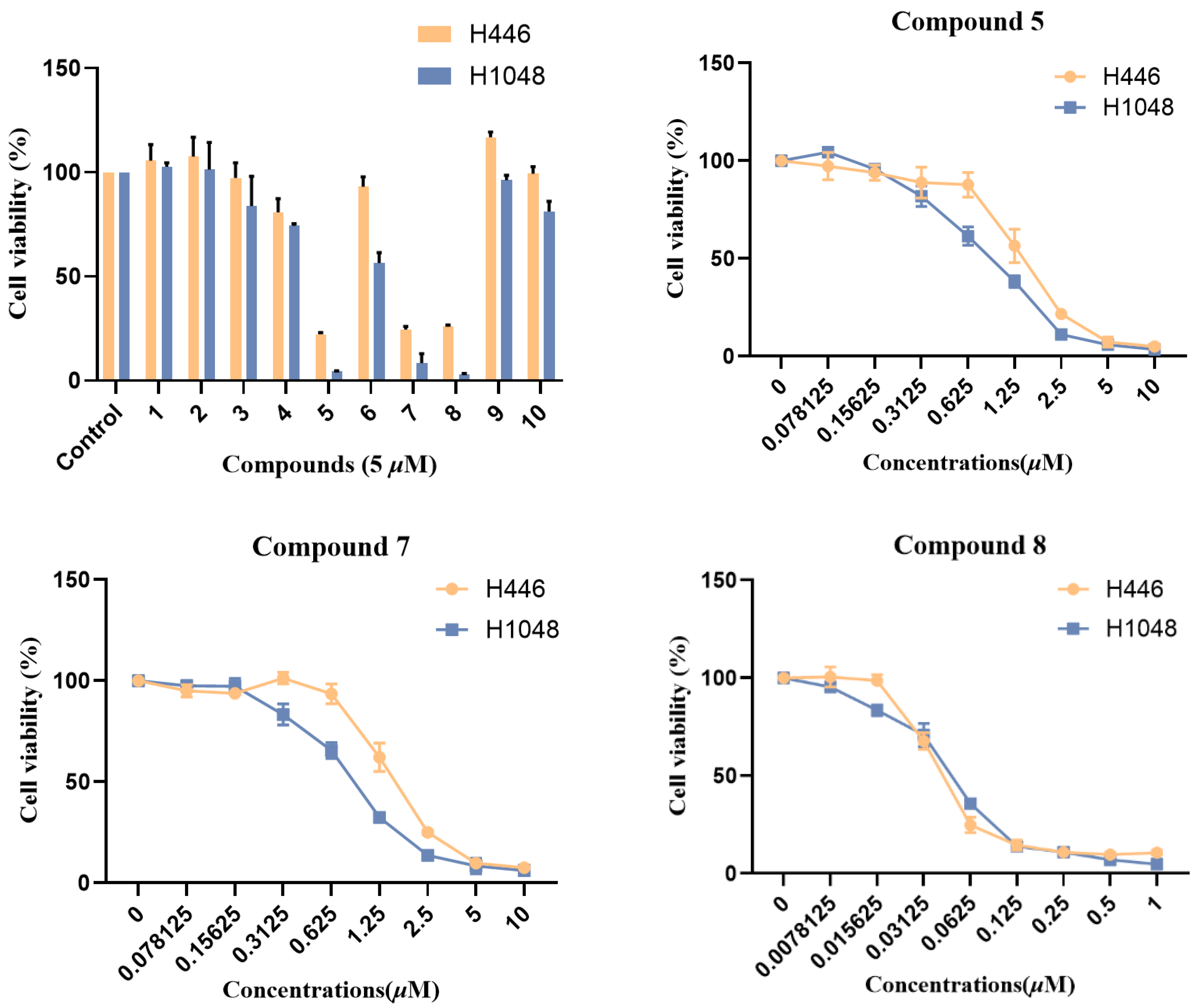 H446 and H1048 cells were purchased from the American Type Culture Collection (ATCC). Cells were seeded in 96-well plates at 5000–8000 cells per well, with each well containing a total volume of 100 μL of media. After 24 h, compounds were serially diluted and added 50 μL to the cells per well. Following four days of incubation. CCK-8 reagents (Selleck chemicals, America) were added, and the 96-well plates were incubated at 37 °C in 5% CO2 incubators for 1–2 h. The absorbance at 450 nm was measured using a microplate reader (Promega) according to the manufacturer’s instructions. The final results were expressed as percentages relative to the vehicle-treated cell group, which was defined as 100% [23,24].