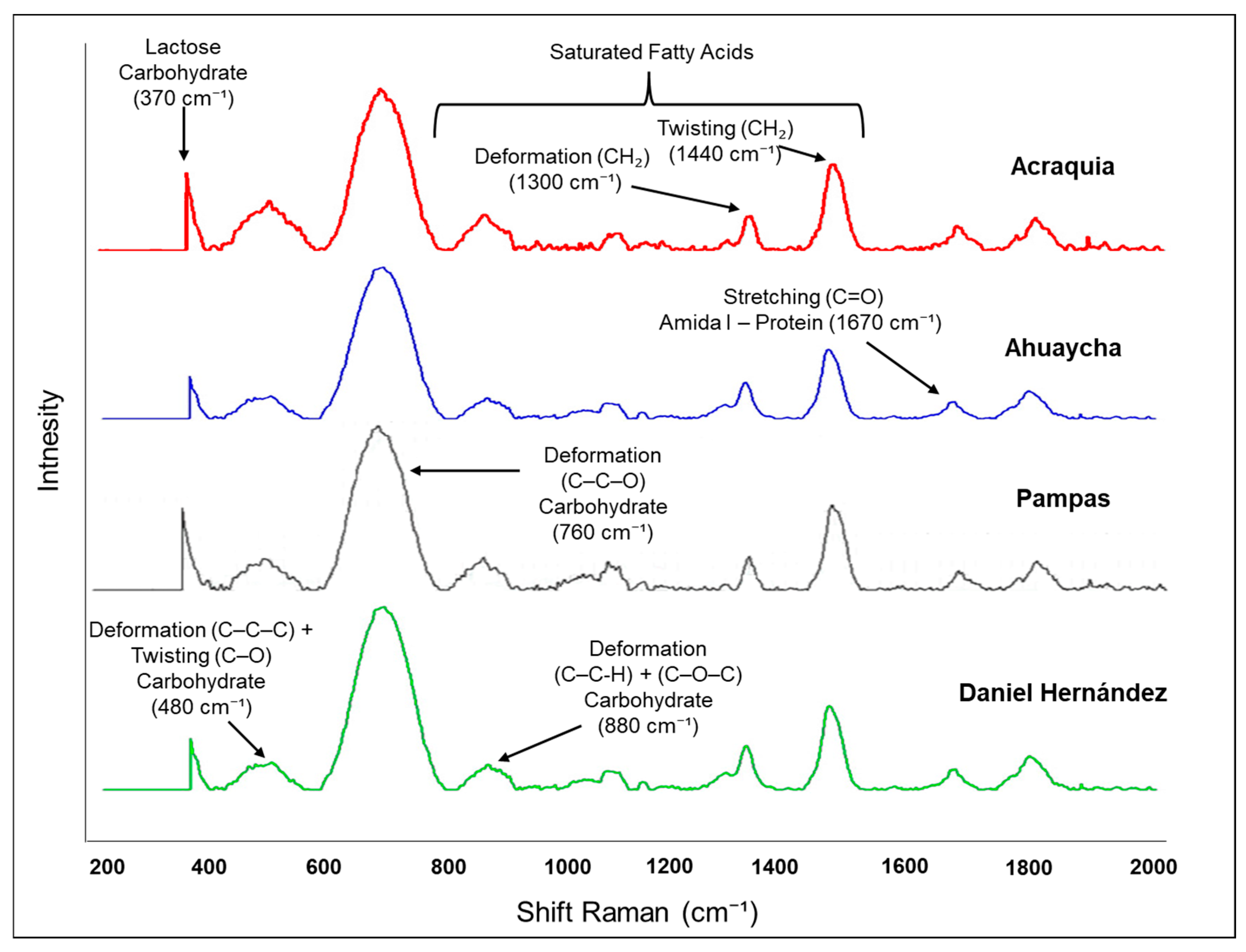 - Kostovska, R.; Cruz, J.; Drouin, G.; Horan, B.; Tobin, J.T.; O’Callaghan, T.F.; Hettinga, K.; Kelly, A.L.; Gómez-Mascaraque, L.G. Use of Raman spectroscopy as a rapid tool to discriminate milk deriving from different pasture-based diets and breeds in a seasonal, spring-calving dairy production system. J. Dairy Sci. 2025, 108, 9205–9221. [Google Scholar] [CrossRef] [PubMed]
