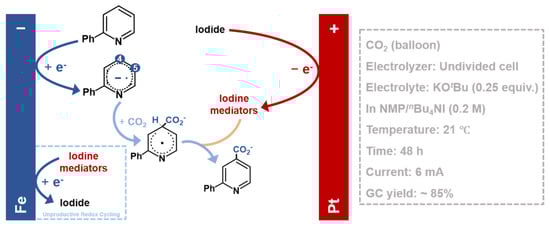 Mechanism for the iodide-mediated paired electrocarboxylation of 2-phenylpyridine. This approach enables electrocarboxylation without a sacrificial anode, based on Ref. [].