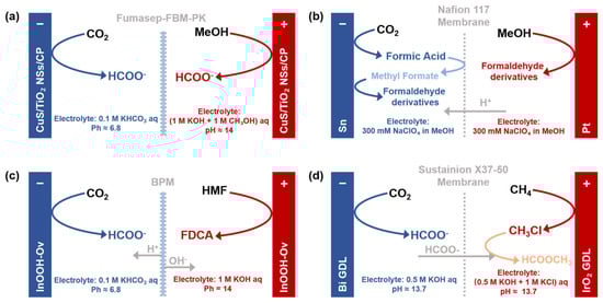 Schematic of paired CO2 electrolysis systems with integrated anodic oxidation of MeOH (alcohol), HMF (biomass-derived aldehyde), or CH4 (fuel) in H-cell (a–c) and flow cell (d) configurations, based on Refs. [,,,].
