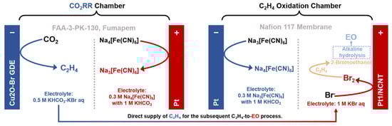 To address inherent challenges such as reaction rate mismatch and mass-transfer limitations, tandem paired electrolysis in membrane-separated reactors has emerged as a promising solution. A representative example is the work by Zhu et al. [] on the tandem synthesis of ethylene oxide (EO) from CO2 (Figure 5). In a bromine-mediated flow cell system, electrocatalytic synergy enables efficient tandem conversion of CO2 to EO. At the anode, in situ-generated Br2/HBrO over a Pt1/NCNT catalyst facilitates ethylene epoxidation to EO, exhibiting a FE of 92.2% at 50 mA·cm−2 with stable performance over 15 h. On the cathode, bromide ions stabilize Cu+ sites within a porous Cu2O electrode, achieving a 66.9% FE for CO2 reduction to C2H4 at 800 mA·cm−2 and maintaining stability for 24 h at 500 mA·cm−2. Crucially, replacing energy-intensive water splitting with a Na4[Fe(CN)6]/Na3[Fe(CN)6] redox mediator substantially lowers the system overpotentials, reducing the CO2 reduction working voltage to −1.41 V at 300 mA·cm−2 (a saving of ~1.55 V) and enabling C2H4 epoxidation at 2.0 V for 100 mA·cm−2 (a saving of ~1.18 V). The integrated tandem system achieves an overall 41.1% single-pass FE for CO2-to-EO conversion (with the CO2RR chamber operating at 800 mA·cm−2 and the C2H4 oxidation chamber at 25 mA·cm−2), underscoring its promise for energy-efficient electrosynthesis.