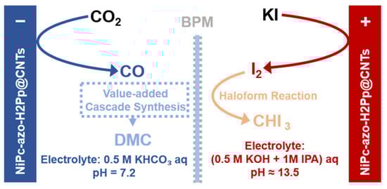 Replacing the OER with thermodynamically more favorable and kinetically faster oxidation reactions presents a pivotal strategy to overcome the energy consumption issue in the CO2RR, the oxidation of halide is a prime example of this approach [,,]. Unlike the sluggish four-electron OER, halide oxidation typically follows a kinetically rapid two-electron pathway, as exemplified by the well-established chlorine evolution reaction in the chlor-alkali industry. Demonstrating this potential, Zhu et al. [] developed a symmetric paired electrolysis system employing a bidirectional electrocatalyst (NiPc-azo-H2Pp@CNTs) that concurrently couples CO2RR with the iodide oxidation reaction (IOR) (Figure 6). This catalyst facilitates proton-coupled electron transfer to promote CO2-to-CO conversion at the cathode, while simultaneously driving the IOR to generate I2 at the anode. The electrogenerated I2 subsequently undergoes a spontaneous haloform reaction to produce valuable iodoform (CHI3), effectively replacing the energy-intensive oxygen evolution reaction (OER). This integrated CO2RR–IOR system requires a cell voltage of only 2.98 V at 30 mA·cm−2, substantially lower than the 3.74 V needed for a conventional CO2RR–OER system, corresponding to a ~20% reduction in energy consumption. The system operated stably for 5 h at 25 mA·cm−2, continuously producing high-purity CO at the cathode and delivering 168 mg of iodoform at the anode. Moreover, the CO produced was further utilized in a cascaded process to synthesize another high-value product, dimethyl carbonate (DMC), at a rate of 6.21 mmol·L−1·h−1.