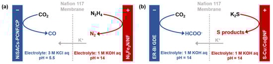 Schematics of paired electrolysis systems for (a) CO2RR and hydrazine oxidation to N2, and (b) CO2RR and sulfide oxidation to sulfur, in flow cells featuring K+ migration through a CEM for charge balance, based on Refs. [,].