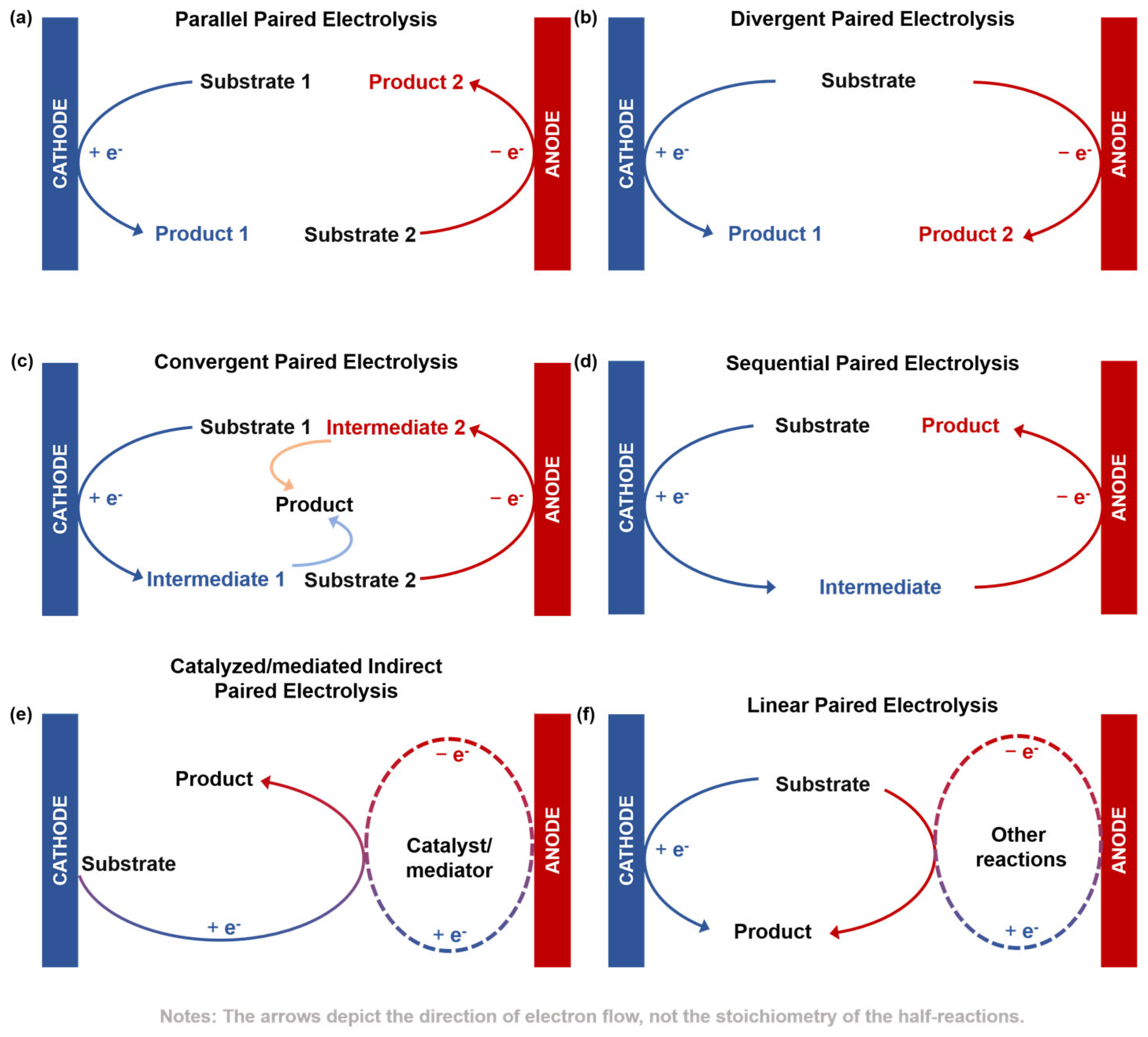 • Divergent paired electrolysis: The same substrate undergoes different reaction path-ways at two electrodes, yielding two distinct valuable products (Figure 1b);