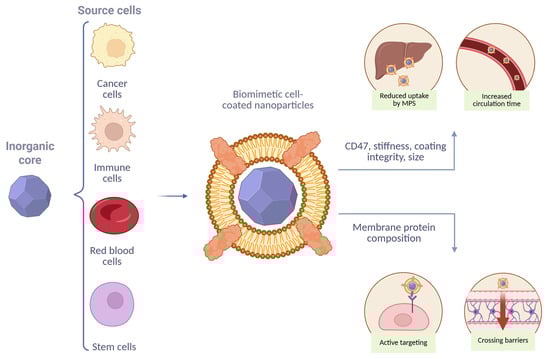 Depending on their fabrication strategies, biomimetic NPs can generally be categorized into three main types: (1) biomimetic cell membrane-coated nanoparticles (BMCNPs), (2) artificial cell-derived vesicles, and (3) fully synthetic vesicles [4]. BMCNPs, one of the most successful approaches, involves coating a synthetic NP core (e.g., poly(lactic-co-glycolic acid) (PLGA), gold, or silica) with natural cell membranes derived from red blood cells (RBCs), platelets, tumor cells, immune cells, or stem cells. This membrane camouflage allows the particles to mimic “self” signatures, thereby avoiding macrophage-mediated phagocytosis and, as a result, prolonging circulation time while reducing nonspecific accumulation in off-target organs. Moreover, it enables active targeting through specific interactions with diseased tissues and provides cross-barrier transport. In addition, the membranes of source cells can transfer their intrinsic therapeutic properties to BMCNPs [5,6,7,8,9].
