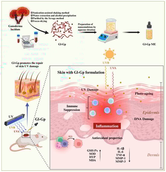 Recent investigations have expanded the understanding of Ganoderma lucidum in skin anti-aging research. Lee et al. demonstrated that glycopeptide- and glycoprotein-enriched fractions derived from a multi-herbal formula containing G. lucidum exhibited anti-wrinkle and skin-firming effects by regulating extracellular matrix-related genes such as MMP-1, COL1A1, and HAS2 []. Similarly, Wang et al. reported that G. lucidum extract alleviated UVA-induced photoaging by maintaining mitochondrial homeostasis, reducing mtROS accumulation, and improving ATP synthesis []. These findings provide valuable evidence for the skin-protective effects of G. lucidum and its related bioactive components. Nevertheless, most existing studies have mainly emphasized biological activity, while aspects related to formulation stability, skin penetration, and transdermal delivery efficiency remain less explored. In light of these observations, the present study attempts to further explore this area by developing a Ganoderma glycoprotein-based microemulsion (Gl-Gp ME) designed to improve the stability, bioavailability, and skin permeability of glycoproteins. This formulation-oriented approach aims to complement previous biological studies and to provide additional experimental evidence on how delivery systems may enhance the topical anti-photoaging potential of G. lucidum glycoproteins. As shown in Figure 1, the schematic overview illustrates the preparation of the Ganoderma lucidum glycoprotein microemulsion (Gl-Gp ME) and its protective mechanism against UV-induced skin photoaging in rats, highlighting its role in improving transdermal delivery and promoting skin repair.