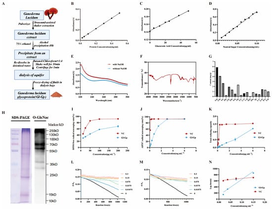 Structural characterization and in vitro antioxidant activities of Ganoderma lucidum glycoprotein (Gl-Gp). (A) Schematic representation of Gl-Gp extraction and purification. (B–D) Standard curves for quantifying (B) protein, (C) neutral sugars, and (D) acidic sugars. (E) β-Elimination assay assessing O-linked glycosylation. (F) FT-IR spectrum of Gl-Gp. (G) Amino acid composition analysis. (H) Identification of O-GlcNAc modification sites. (I–K) Antioxidant capacity evaluation: (I) DPPH radical scavenging, (J) ABTS+ radical scavenging, (K) total reducing power. (L,M) Kinetics of pyranine fluorescence bleaching for varying concentrations of (L) Gl-Gp and (M) vitamin C (VC). (N) Correlation between concentration and lag time for VC and Gl-Gp. Statistical significance was determined using one-way ANOVA with Tukey’s post hoc test. Data are presented as mean ± SD (n = 3).