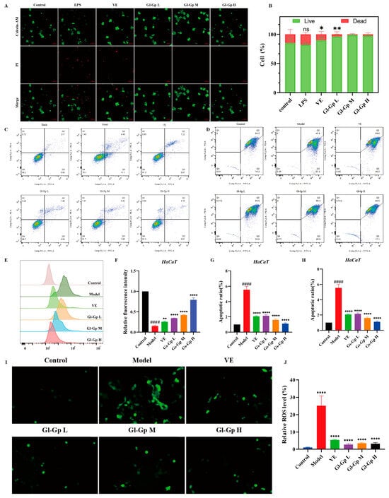 Protective effects of Ganoderma lucidum glycoprotein (Gl-Gp) on LPS-induced cytotoxicity in RAW264.7 cells and UVB-induced apoptosis, mitochondrial dysfunction, and ROS accumulation in HaCaT cells. Live/dead staining of RAW264.7 cells after LPS treatment is shown in (A,B). Apoptosis of HaCaT cells was analyzed using flow cytometry (C–F), and mitochondrial membrane potential was evaluated via JC-1 staining combined with flow cytometry (D–G). ROS levels in HaCaT cells following UVB irradiation were assessed by fluorescence staining (E–H), and intracellular ROS was further visualized using immunofluorescence imaging (I,J). Data are presented as mean ± SD (n = 3). Statistical significance was analyzed using one-way ANOVA with Tukey’s post hoc test. * p < 0.05, ** p < 0.01, **** p < 0.0001 vs. model group. #### p < 0.0001 vs. Control group.