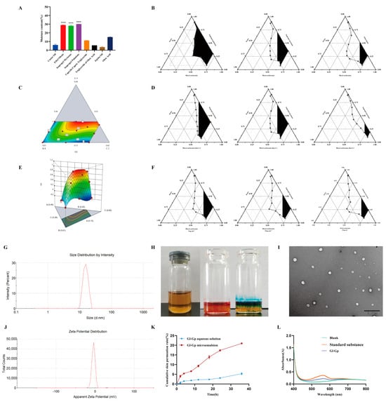 A 15 mg/mL Gl-Gp solution was incorporated as the aqueous phase, with IPM as the oil phase and a soybean phospholipid–ethanol mixture as the surfactant system (Km = 1). The components were combined at a mass ratio of 0.260:0.365:0.375, and the aqueous phase was added dropwise to produce a uniform microemulsion. The prepared Gl-Gp microemulsion was transparent and stable, with an encapsulation efficiency of 96.17 ± 0.11% and a drug loading of 3.70 ± 0.07 mg/g, demonstrating high encapsulation and loading capacity.