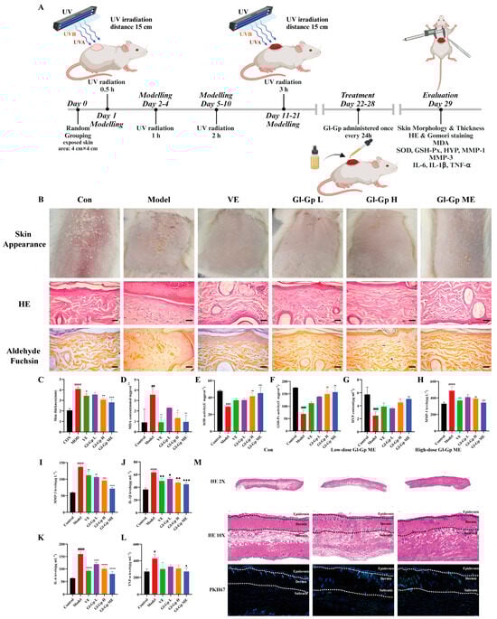Protective effects of Ganoderma lucidum glycoprotein microemulsion (Gl-Gp ME) on UVA + UVB-induced skin damage in rats. (A) Experimental timeline for establishing the UVA + UVB-induced skin photodamage model. (B) Representative dorsal skin images of each treatment group after 21 days of UVA + UVB exposure, including hematoxylin and eosin (H&E) and aldehyde fuchsin staining. Scale bar: 100 µm. (C) Quantitative analysis of total skin thickness. (D–L) Measurement of oxidative stress markers and inflammatory mediators in rat skin, including malondialdehyde (MDA), superoxide dismutase (SOD), glutathione peroxidase (GSH-Px), hydroxyproline (HYP), matrix metalloproteinases (MMP-1, MMP-3), and proinflammatory cytokines (IL-1β, IL-6, TNF-α). (M) Representative H&E-stained images of epidermis, dermis, and subcutaneous tissue in the normal group, low-dose Gl-Gp ME group, and high-dose Gl-Gp ME group, along with immunofluorescence staining showing drug distribution in the skin. Data are expressed as mean ± SD (n = 3). Statistical significance was determined by one-way ANOVA followed by Tukey’s post hoc test. * p < 0.05, ** p < 0.01, *** p < 0.001, **** p < 0.0001 vs. model group. # p < 0.05, ## p < 0.01, ### p < 0.001, #### p < 0.0001 vs. Control group.