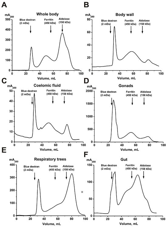 Isolation of protein complexes from the sea cucumber P. chilensis by FPLC gel filtration on a Sepharose 4B column using homogenates of intact sea cucumbers (A) and their different organs and tissues: body wall (B), coelomic fluid (C), gonads (D), respiratory trees (E), and gut (F).