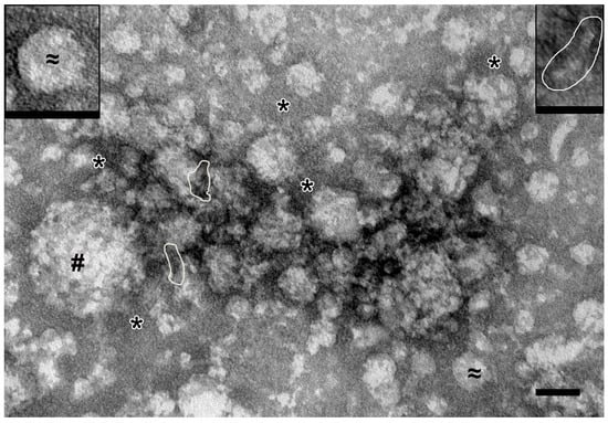 Representative image of complexes obtained by ultracentrifugation from full holothurian body including visceral organs. #—spherical particles of 40–140 nm (protein complexes); ≈ and insert—spherical particles of 30–40 nm (protein complexes); *—fine background material; stacks of “sticks” are shown by contour. TEM, negative staining by uranyl acetate. Length of scale bars corresponds to 50 nm.