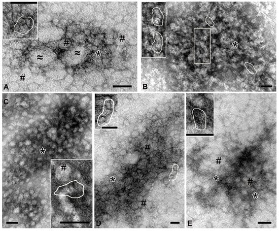 Representative images of complexes obtained by ultracentrifugation from different holothurian organs. (A)—coelomic fluid: #—spherical particles 20–30 nm; ≈—oval particles, up to 200 nm; *—an accumulation of small elements not organized into distinct structures. (B)—gut: stacks of “sticks” are shown in frames; *—accumulation of elements. (C)—respiratory trees: #—spherical particles; *—fine-grained material. (D)—gonads: #—spherical particles; *—accumulation of elements. (E)—body wall: #—spherical particles; *—fine-grained material. In all images, contours show stacks of “sticks”. Transmission electron microscopy, negative contrast. Length of scale bars corresponds to 50 nm.