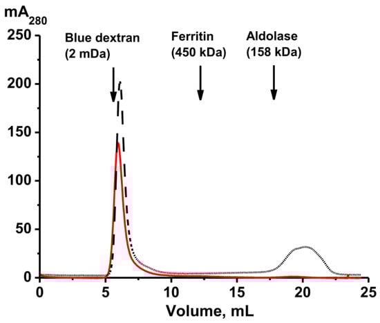 The top of the principal first peak (Figure 1) corresponding to the initial complex has shifted slightly compared to the peak before treatment, but peaks of proteins with lower molecular weights have appeared. Most likely, the complex of the core components of the original complex is even more stable. This is consistent with the data on the stability of other multiprotein complexes described earlier [,,,,].