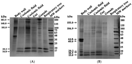 SDS-PAGE analysis of multiprotein complexes (4–16 µg) from different organs of sea cucumbers. Separation was performed on a 4–18% gradient gel before (A) and after (B) treatment with DTT. Molecular mass markers are indicated. The gels were stained using Coomassie R-250. For other details, see Section 4.