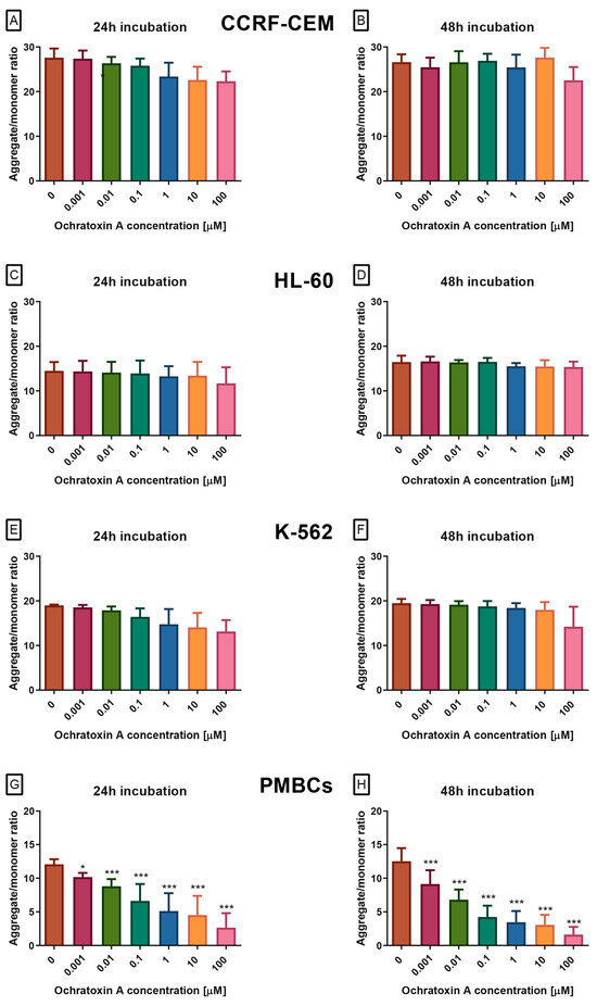 To gain a deeper understanding of the toxic potential of OTA in human leukemia cells and healthy peripheral blood mononuclear cells, ΔΨM was evaluated using the JC-1 fluorescent probe, which is not influenced by mitochondrial morphology, size, or density. In leukemia cell lines CCRF-CEM, K-562, and HL-60, OTA exposure did not significantly alter the JC-1 aggregate-to-monomer fluorescence ratio (Figure 2A–F), indicating no measurable effect on ΔΨM. In contrast, PBMCs displayed a clear, dose- and time-dependent reduction in this ratio (Figure 2G,H), reflecting mitochondrial depolarization, an early event in intrinsic apoptosis. This decrease was evident across the full concentration range tested (0.1–100 µM) and reached statistical significance at all concentrations and incubation periods.