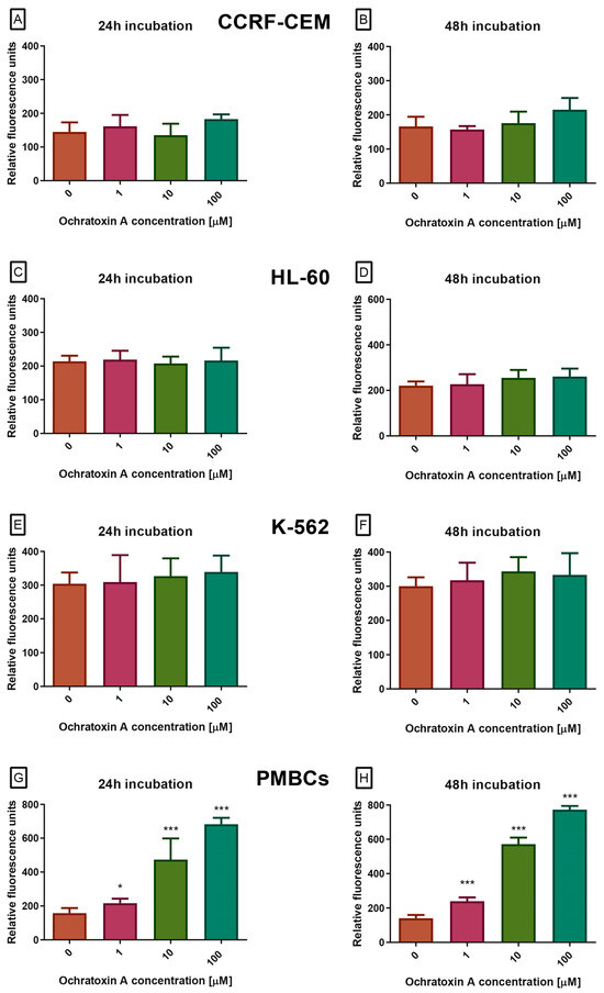 At the next stage, caspase activity in cells exposed to OTA was examined. Caspases are cysteine proteases that play a central role in apoptosis, controlling both its initiation and execution phases. Among them, caspases-3 and -7 act as the main executioners, cleaving numerous cellular substrates and driving the characteristic morphological and biochemical features of apoptotic cell death. Because of this function, caspase-3/7 activity is widely recognized as a hallmark of the execution phase of programmed cell death. In our study, OTA at concentrations of 0.001–100 µM, after 24 or 48 h, did not alter caspase activity in the CCRF-CEM, K-562, or HL-60 cell lines (Figure 3A–F). In contrast, PBMCs treated with OTA showed a dose- and time-dependent increase in caspase-3/7 proteolytic activity, measured as green fluorescence (excitation/emission 485/538 nm, Figure 3G,H). All tested concentrations produced a statistically significant effect.