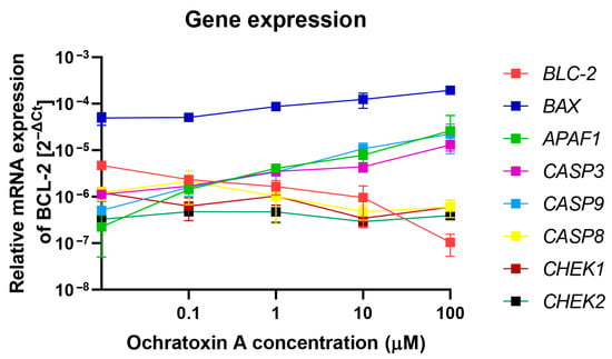 To confirm activation of apoptosis process in PMBCs by OTA molecular analysis of the expression of key genes involved in apoptosis was performed. The analysis of mRNA levels in PBMCs treated by OTA were assessed using the RT-qPCR method. The purity of isolated RNA samples measured as the A260/280 ratio was in the range of 1.8–2. Three groups of genes were analyzed. The first category consisted of genes involved in the intrinsic apoptotic pathway, including BCL-2 (anti-apoptotic protein that inhibits mitochondrial cytochrome C release), BAX (pro-apoptotic protein promoting mitochondrial outer membrane permeabilization), and APAF1 (apoptotic protease activating factor 1, a key adaptor protein required for apopto-some formation and caspase-9 activation). The second category covered genes encoding caspases—CASP3, CASP8, and CASP9. The third category comprised genes associated with cell-cycle control, namely CHEK1 and CHEK2. The results of this analysis has been demonstrated at Figure 4. Within the intrinsic pathway gene set, BCL-2 expression declined in a dose-dependent manner, while BAX and APAF1 were upregulated, consistent with activation of the mitochondrial apoptotic pathway. For the caspase genes, increased expression was detected for CASP3 and CASP9, whereas CASP8 showed no significant change. Likewise, transcript levels of the cell-cycle checkpoint genes CHEK1 and CHEK2, which encode serine/threonine kinases involved in DNA damage sensing and G1/S or G2/M cell-cycle arrest, remained unaltered. These genes were included as controls to assess whether OTA induces DNA-damage–mediated cell-cycle checkpoints, in addition to triggering apoptosis.