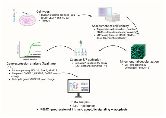 A schematic summary of the effects of OTA on leukemia cell lines and healthy PBMCS is presented in Figure 5. The diagram integrates findings obtained from cytotoxicity assays, mitochondrial membrane potential measurements, caspase activation analyses, and gene expression profiling.