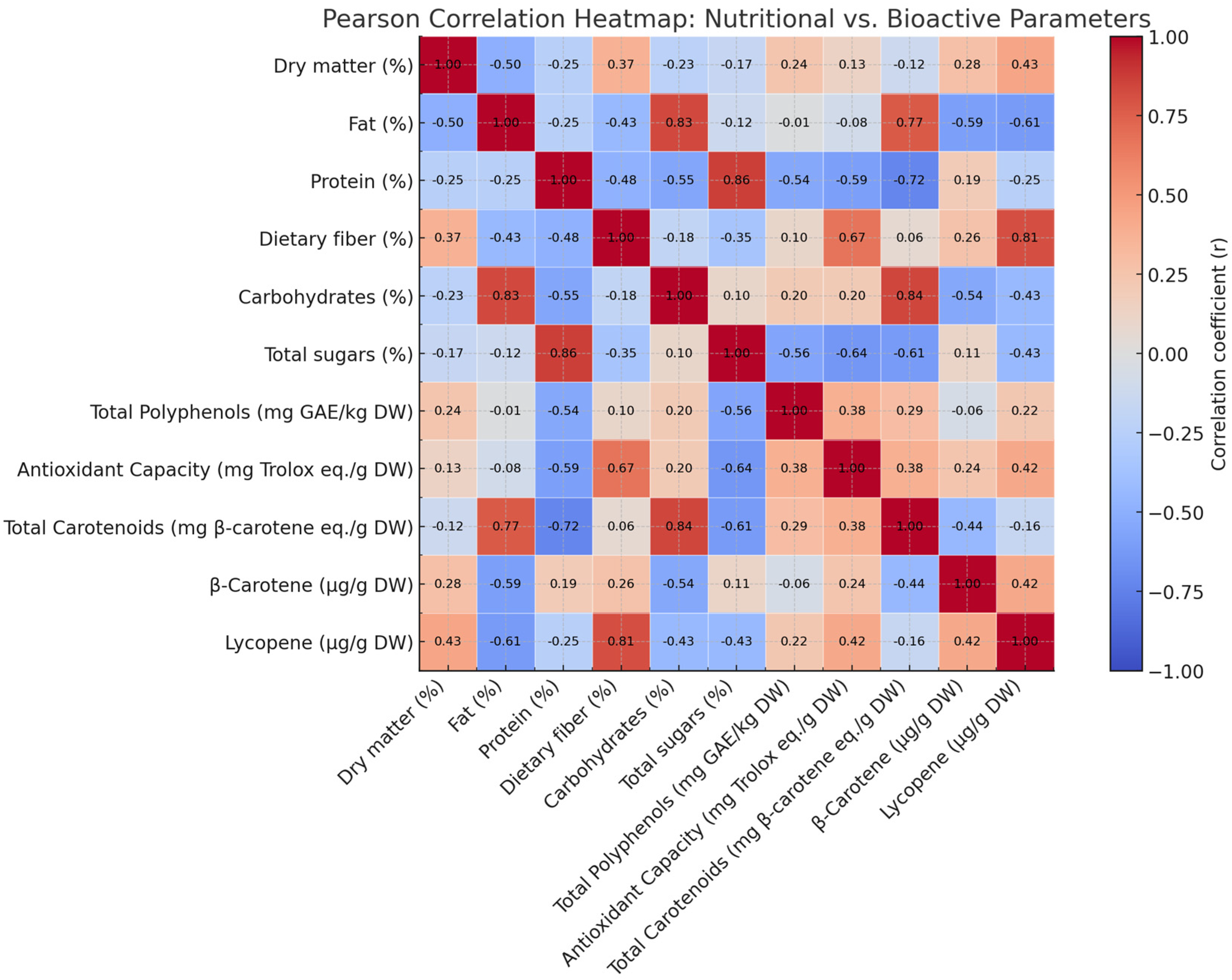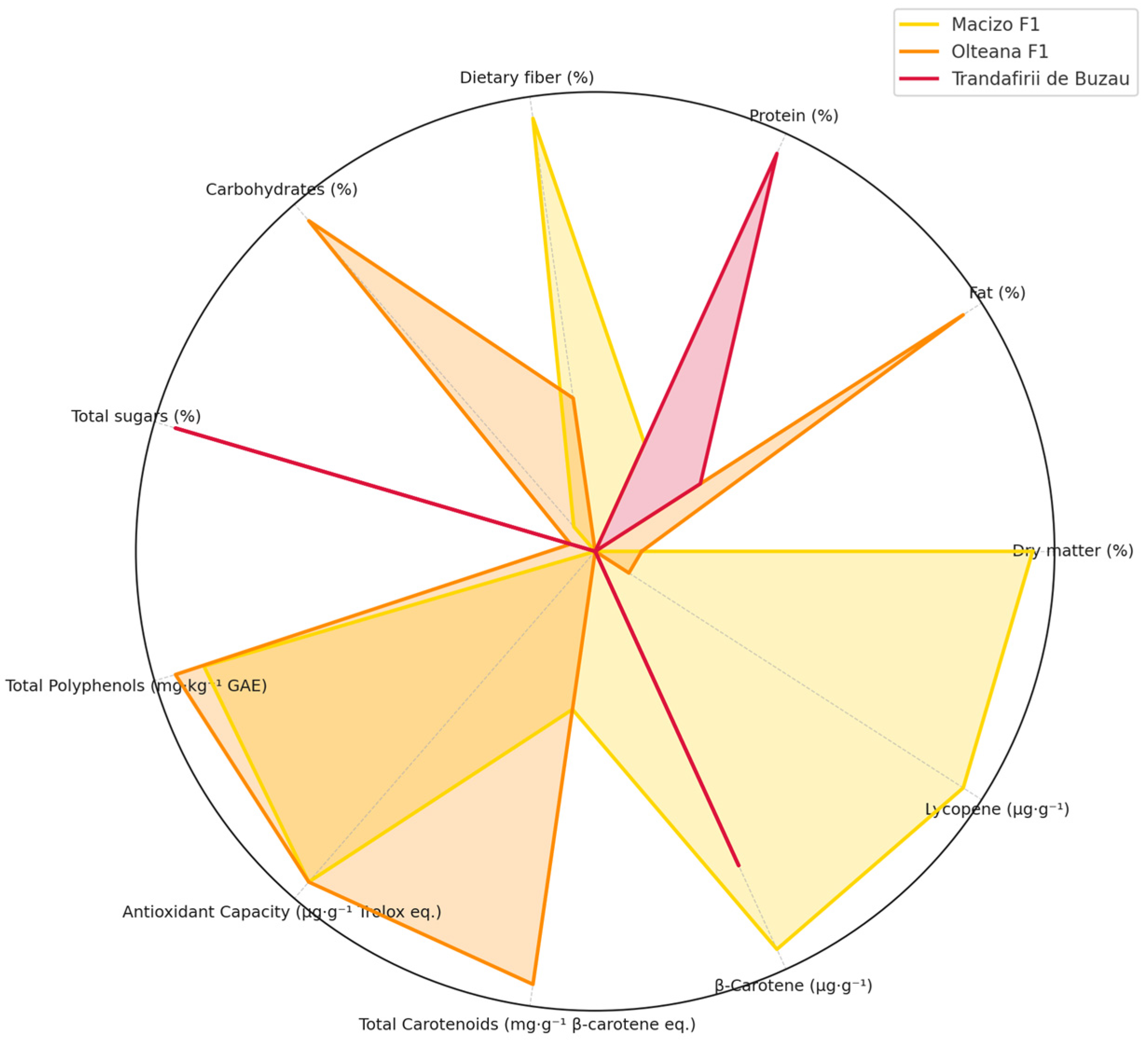 | Sample Name | Total Polyphenols (mg GAE.kg−1) | Antioxidant Capacity (µg eq Trolox. g−1 ) | Total Carotenoids (mg eq. β-carotene. g−1) | β-Carotene (µg g−1) | Lycopene (µg g−1) |