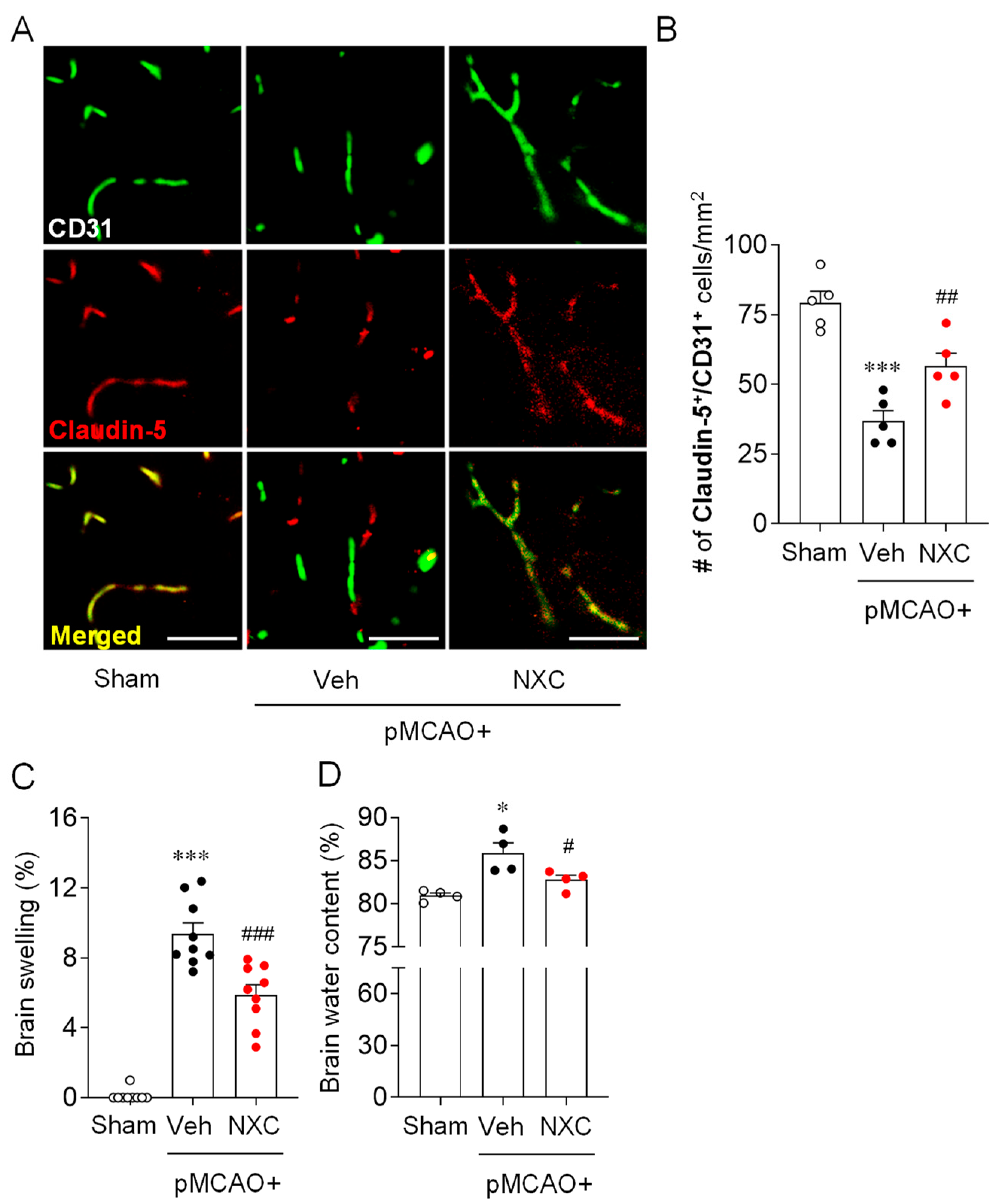 2.2. NXC736 Ameliorates BBB Disruption and Reduces Brain Edema in the Post-Ischemic Brain After pMCAO Challenge