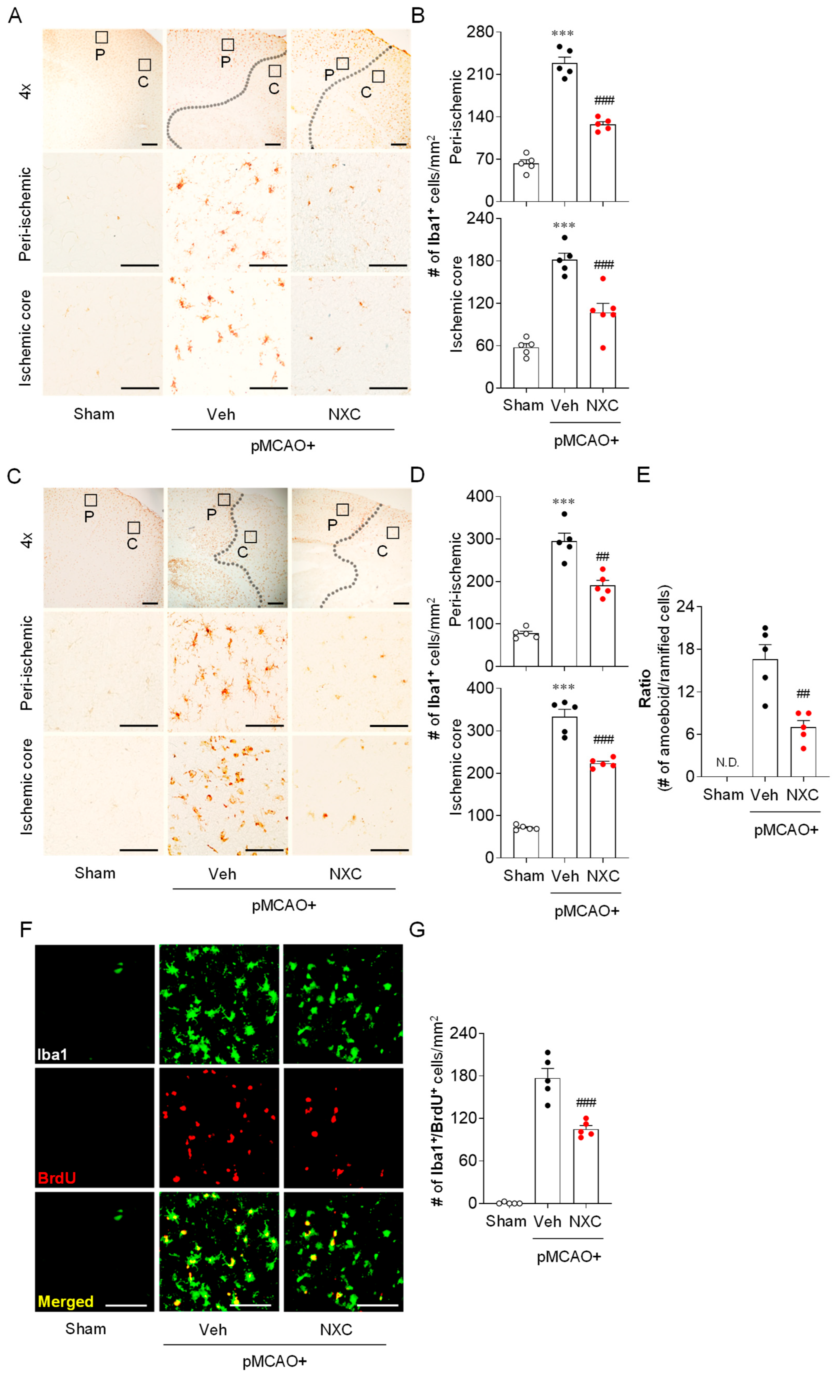 2.3. NXC736 Attenuates Microglial Activation and Proliferation in Post-Ischemic Brain After pMCAO Challenge