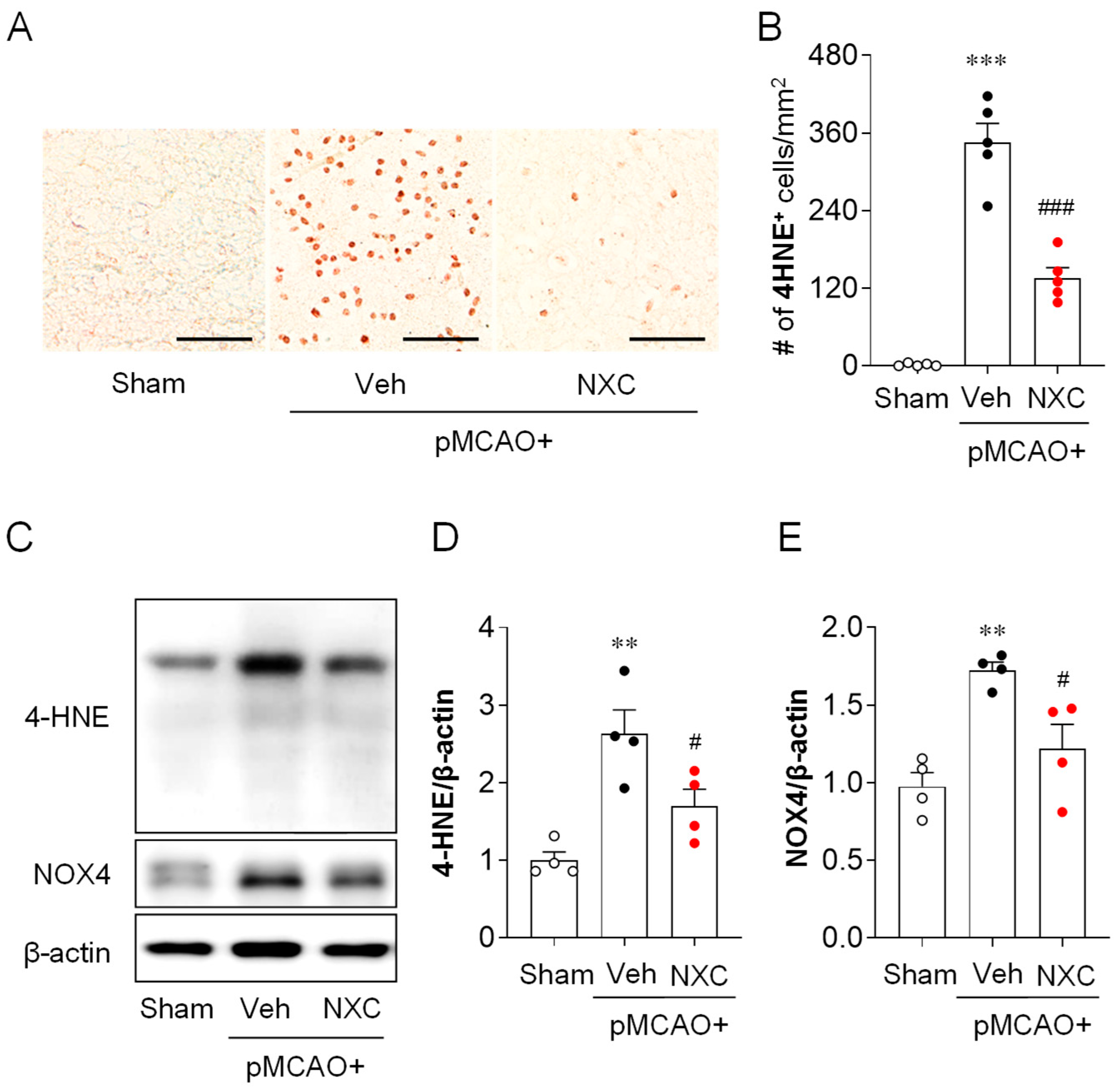 2.4. NXC736 Attenuates Oxidative Stress in the Post-Ischemic Brain After pMCAO Challenge