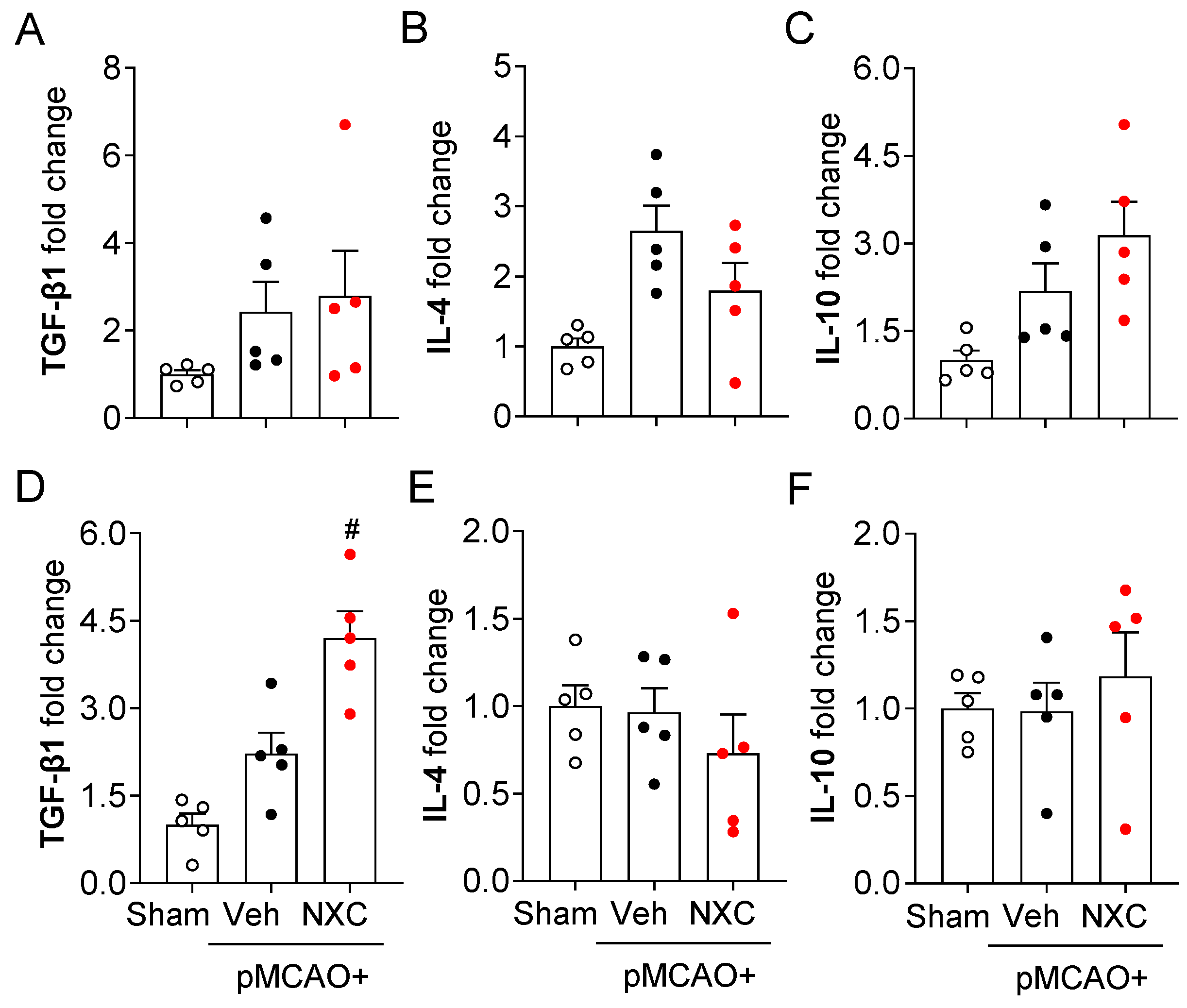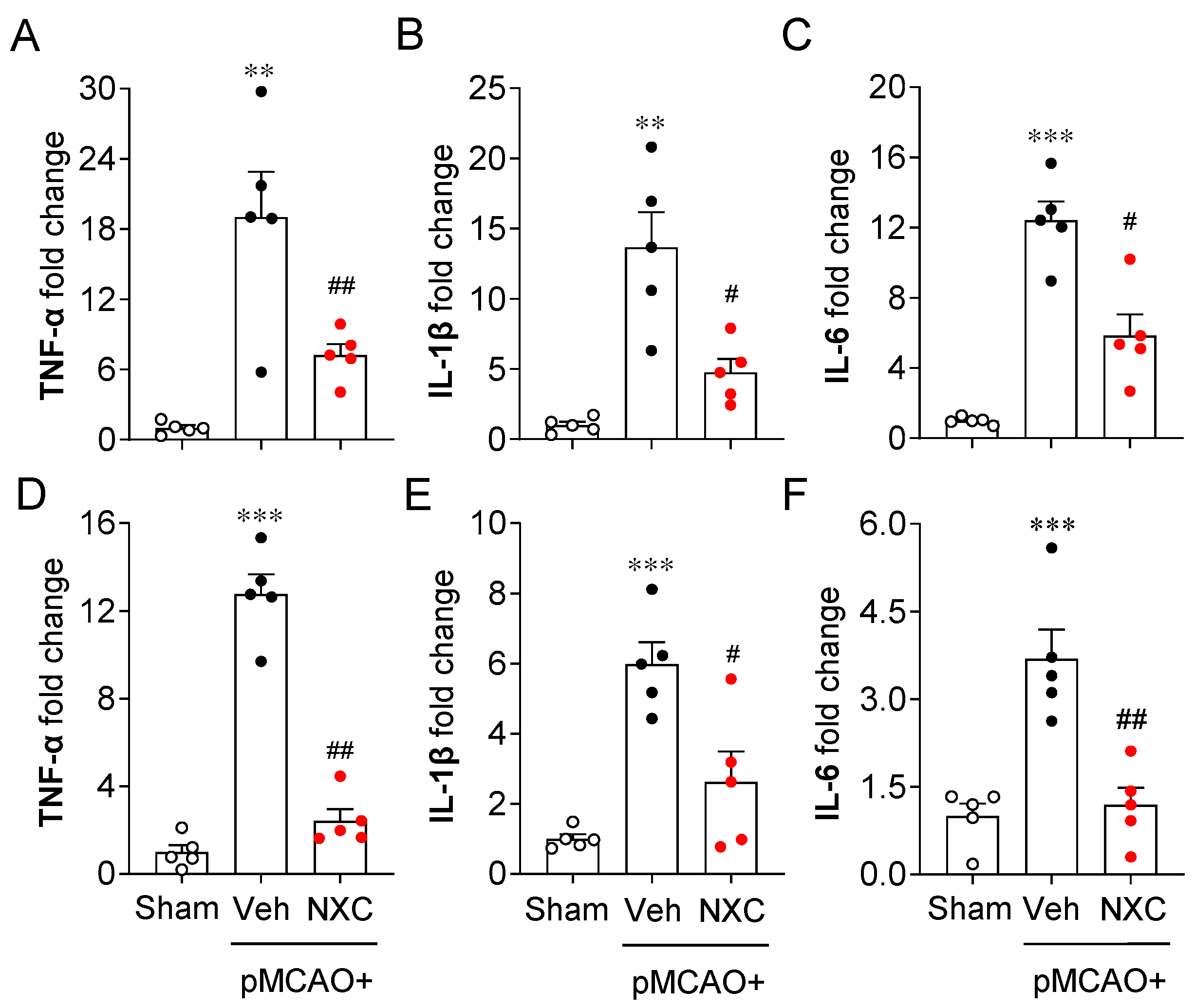 2.5. NXC736 Downregulates Pro-Inflammatory Cytokine mRNA Expression Without Affecting Anti-Inflammatory Cytokine Expression in Post-Ischemic Brain After pMCAO Challenge
