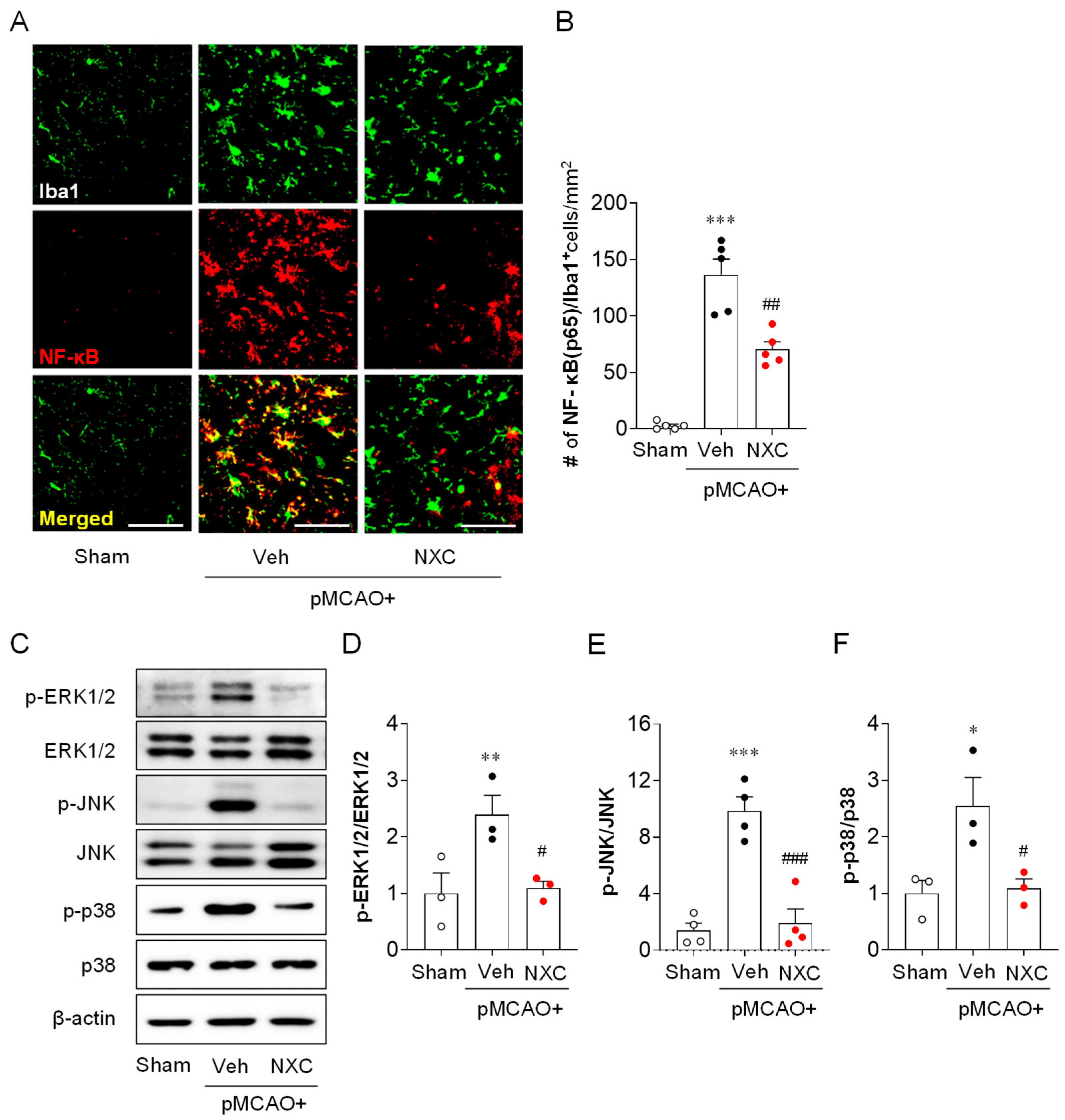 2.6. NXC736 Attenuates NF-κB Upregulation in Activated Microglia and MAPK Activation in the Post-Ischemic Brain After pMCAO Challenge