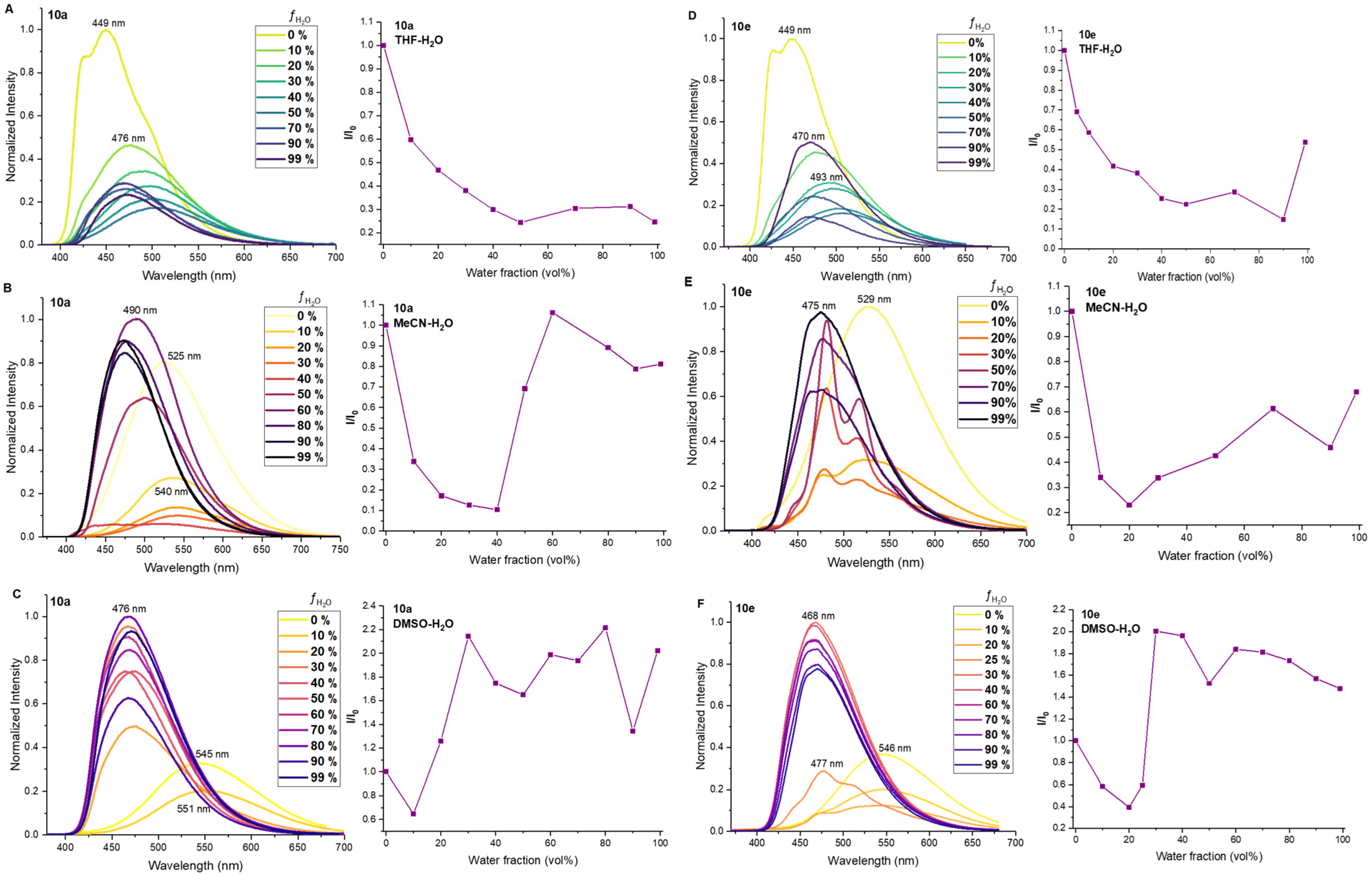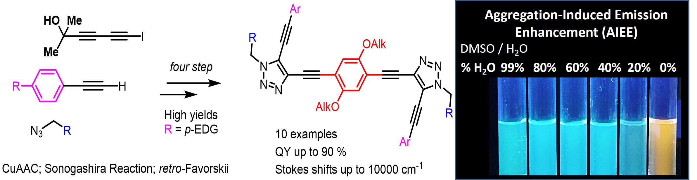 (((2,5-Bis(octyloxy)-1,4-phenylene)bis(ethyne-2,1-diyl))bis(5-((4-(dimethylamino)phenyl)ethynyl)-1H-1,2,3-triazole-4,1-diyl))bis(hexane-6,1-diyl) dipropionate (10a) was synthesized in accordance with the general procedure from alkyne 8a (35 mg, 0.0892 mmol), 1,4-diiodobenzene 9a (26.1 mg, 0.0446 mmol), Pd(PPh3)4 (3.1 mg, 0.0027 mmol), CuI (0.5 mg, 0.0027 mmol) and DIPA (0.500 mL, 3.57 mmol) with a reaction time of 2 h. The crude product was purified by recrystallization from acetonitrile/water (50:1) to afford 10a as a yellow solid (30 mg, 60%). 1H NMR (400 MHz, CDCl3) δ 7.46–7.37 (m, 4H, Ar), 7.08 (s, 2H, Ar), 6.69–6.61 (m, 4H, Ar), 4.43 (t, J = 7.0 Hz, 4H, 2CH2), 4.04 (t, J = 6.5 Hz, 4H, 2CH2), 3.98 (t, J = 6.8 Hz, 4H, 2CH2), 3.02 (s, 12H, 2NMe2), 2.30 (q, J = 7.6 Hz, 4H, 2CH2), 2.06–1.94 (m, 4H, 2CH2), 1.74 (p, J = 7.0 Hz, 4H, 2CH2), 1.66–1.58 (m, 4H, 2CH2), 1.48–1.31 (m, 12H, 6CH2), 1.28–1.17 (m, 14H, 7CH2), 1.12 (t, J = 7.6 Hz, 6H, 2CH3), 0.83 (t, J = 6.8 Hz, 6H, 2CH3). 13C NMR (101 MHz, CDCl3) δ 174.7, 153.8, 151.1, 133.2, 133.0, 124.7, 117.7, 114.0, 111.7, 107.5, 105.0, 91.6, 84.2, 71.8, 70.1, 64.3, 49.3, 40.2, 31.9, 29.7, 29.38, 29.37, 29.3, 28.6, 27.7, 26.2, 26.0, 25.6, 22.8, 14.2, 9.3. HSMS ESI: [M + H]+ calcd. for C68H91N8O6+ 1115.7056; found: 1115.7057.