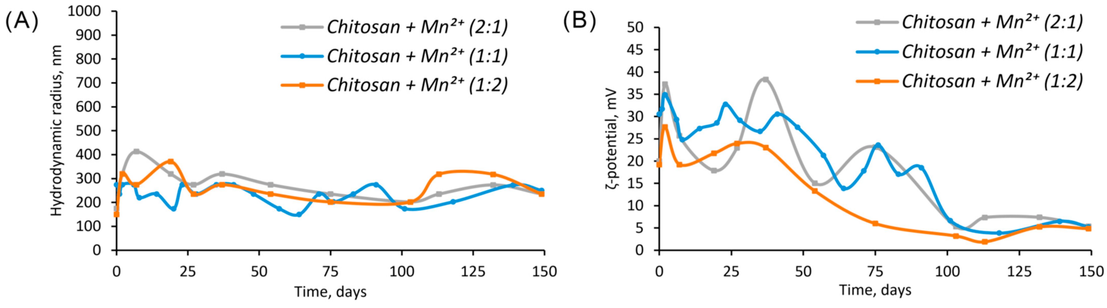 - We successfully synthesized and fully characterized nanoparticles based on chitosan and manganese(II) ions in various molar ratios: Chitosan + Mn2+ (1:2), Chitosan + Mn2+ (1:1), and Chitosan + Mn2+ (2:1);