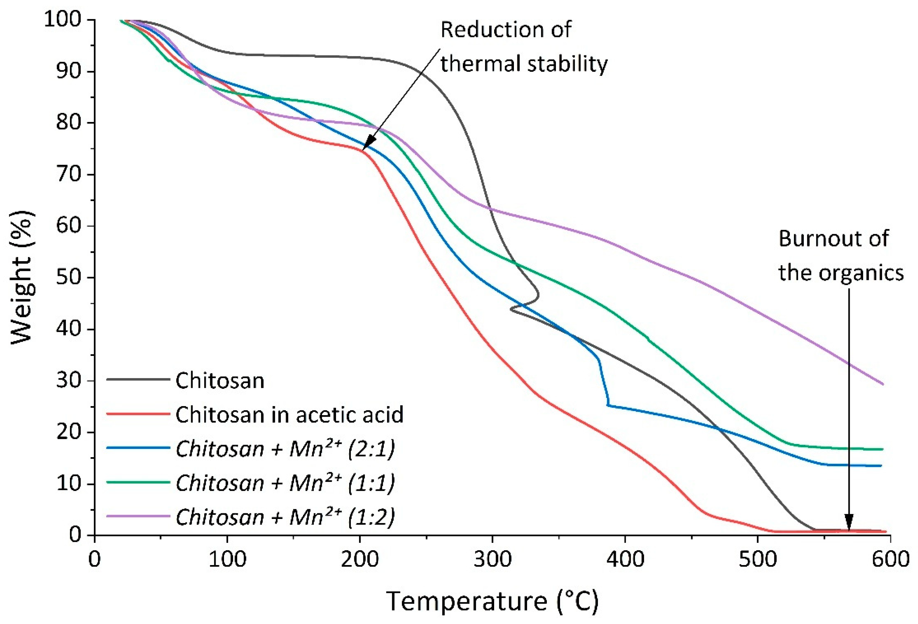 | Chitosan | Chitosan in Acetic Acid | Chitosan + Mn2+ (2:1) | Chitosan + Mn2+ (1:1) | Chitosan + Mn2+ (1:2) | |
