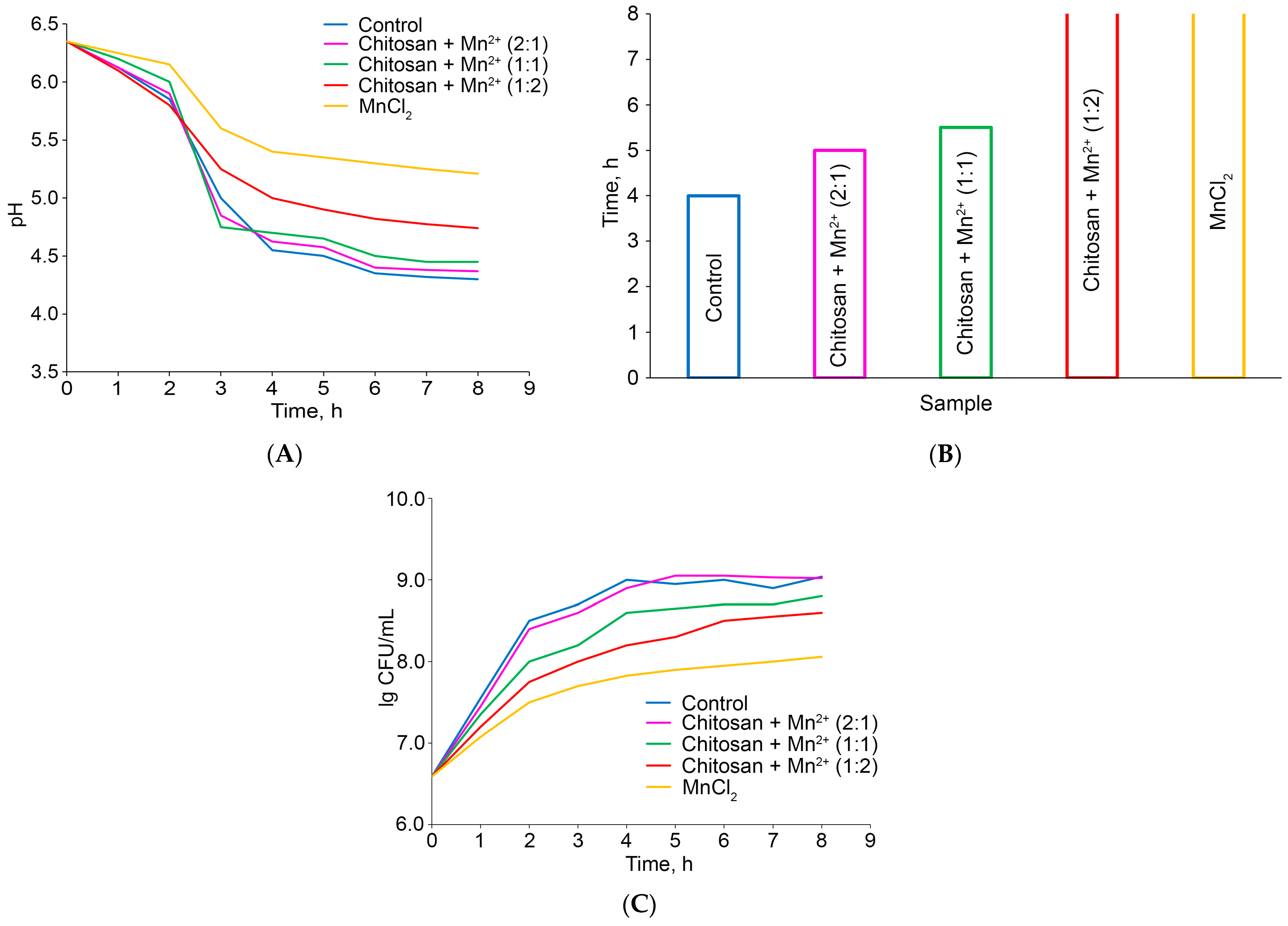 2.2.1. Effect of Chitosan–Mn2+ Systems on Fermentation: Kinetics, pH Changes, and Dynamics of CFU Number Changes