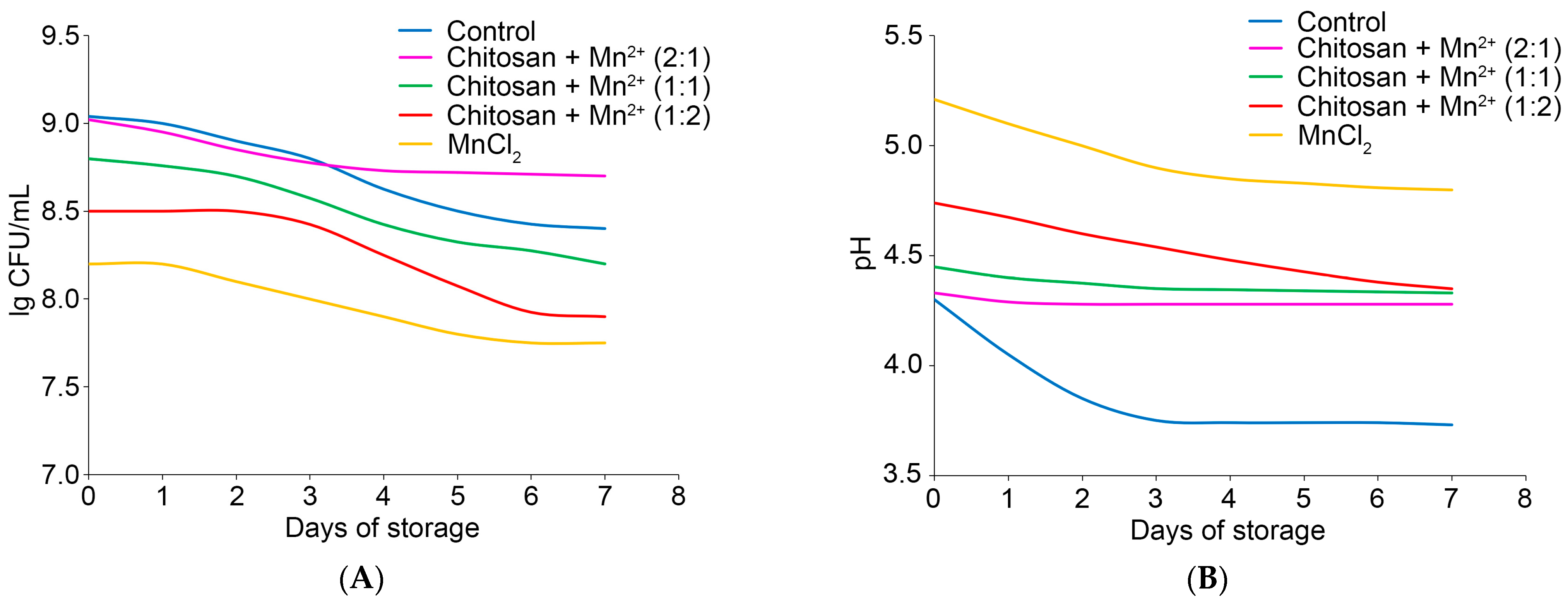 2.2.2. Effect of Chitosan–Mn2+ Systems on Post-Acidification: Dynamics of Changes in the Number of CFU and pH of the Fermented Product During Storage