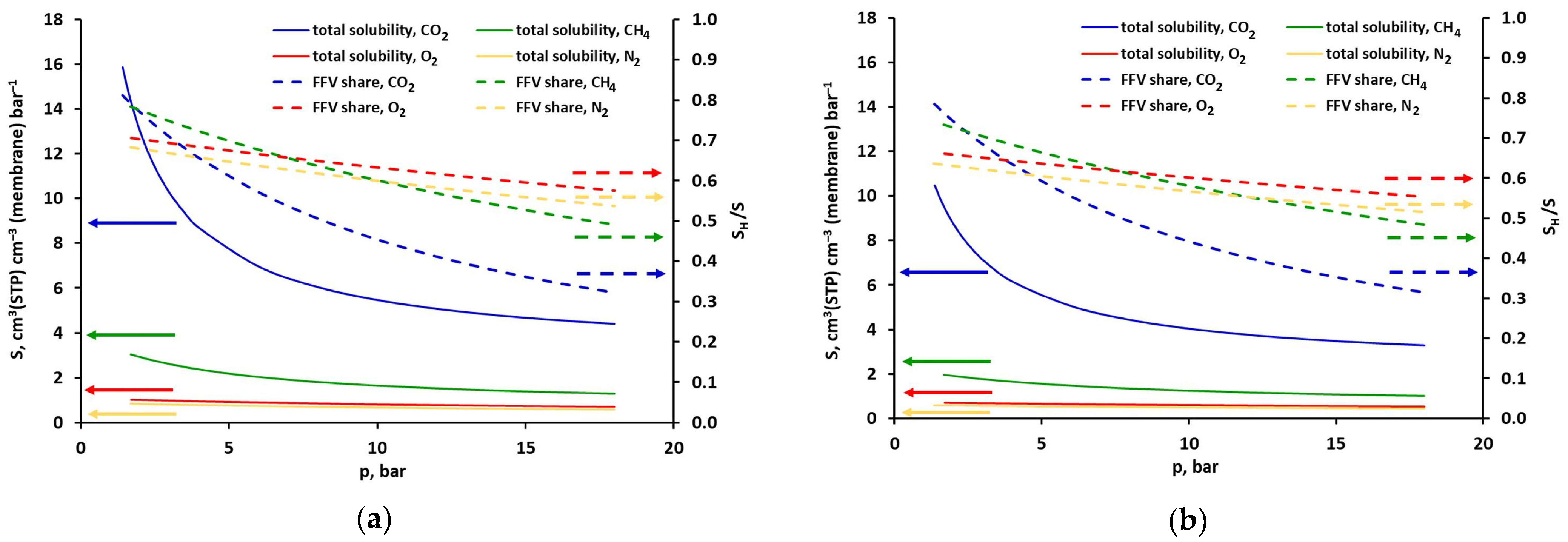 - Hu, C.-C.; Chang, C.-S.; Ruaan, R.-C.; Lai, J.-Y. Effect of Free Volume and Sorption on Membrane Gas Transport. J. Membr. Sci. 2003, 226, 51–61. [Google Scholar] [CrossRef]