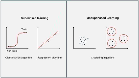 ML can be broadly divided into supervised learning (where labelled data means the output is known) and unsupervised learning (where unlabelled data means there is no output). These methods are often combined to build a final model or make inferences (Figure 2). Even simple regression can be implemented manually, but ML frameworks benefit from scalability and efficiency through the ability to chain different algorithms in pipelines (excluding deployment in this context) []. Moreover, in the presented applications, no component automatically acquires new data, preprocesses it, builds new iterations of predictions, and immediately deploys them into production, simply because of the limited amount of available data.
