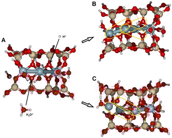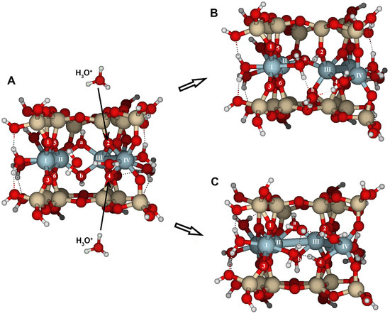 Figure 10). The water molecules released after the dissociation of hydronium ions and the adsorption of protons appear to connect to the edge by completing the Al coordination sphere, while also enabling protons to migrate between oxygens through hydrogen bonds. These findings highlight the active role of water molecules in silicate dissolution by adsorption and as carriers of proton mobility. Likely, breaking bonds would have required prior protonation reactions, increased the positive charge density, and caused more severe structural distortions. Nonetheless, in natural conditions, with a complete set of water molecules in the hydration sphere, spare water molecules can also enter the solvation sphere and have no impact on the system stability.