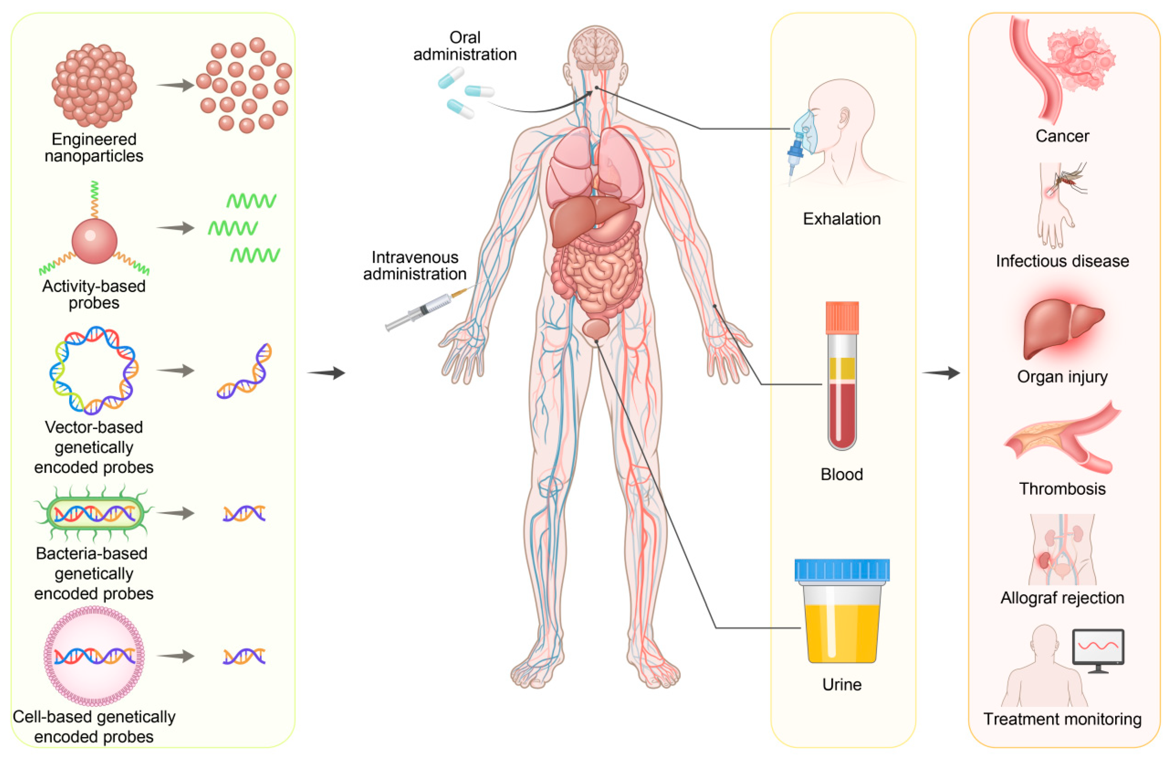 | Conventional endogenous biomarkers | Naturally occurring proteins, nucleic acids, cells, metabolites, exosomes |