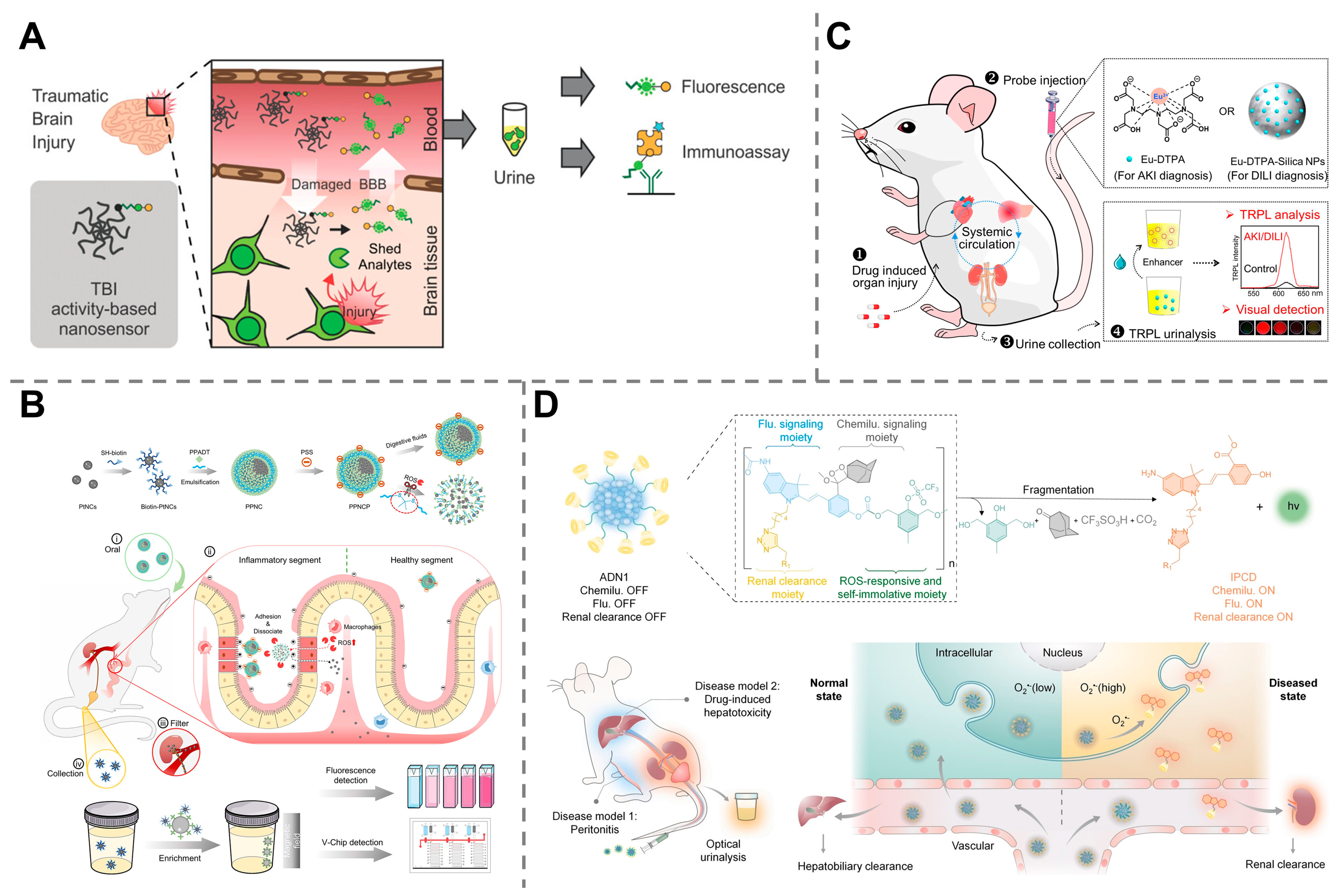 - Huang, J.; Chen, X.; Jiang, Y.; Zhang, C.; He, S.; Wang, H.; Pu, K. Renal clearable polyfluorophore nanosensors for early diagnosis of cancer and allograft rejection. Nat. Mater. 2022, 21, 598–607. [Google Scholar] [CrossRef] [PubMed]